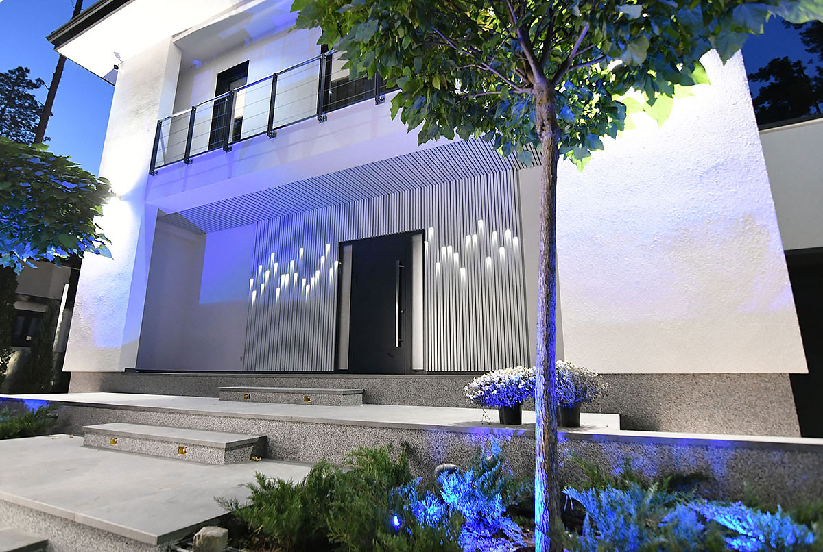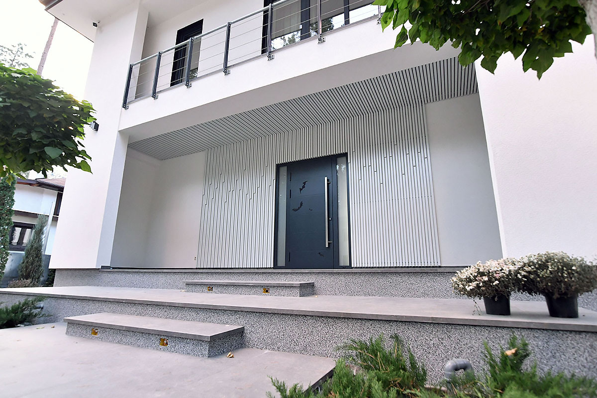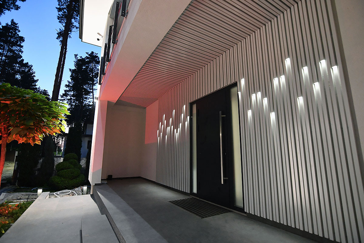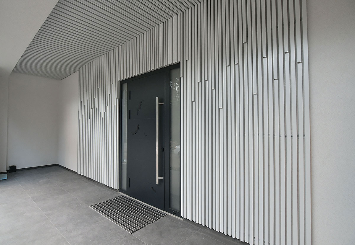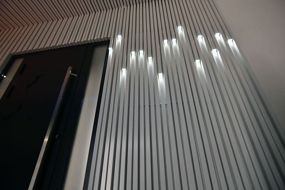 It is believed that suspended ceilings in general and cube-shaped rail in particular can be used exclusively on commercial real estate. But we, as a manufacturer, strongly disagree with this opinion. And our photo report is the best proof of that. In this case, I would like to note several interesting points at once - the rail is used: a) in a private house; b) outdoors; c) not only on the ceiling, but also on the wall; d) a combination of slats of different heights made it possible to place hidden lighting and create a decorative effect of "drops on glass". Let's dwell on these points in more detail and analyze all the advantages of using a cubic lath.