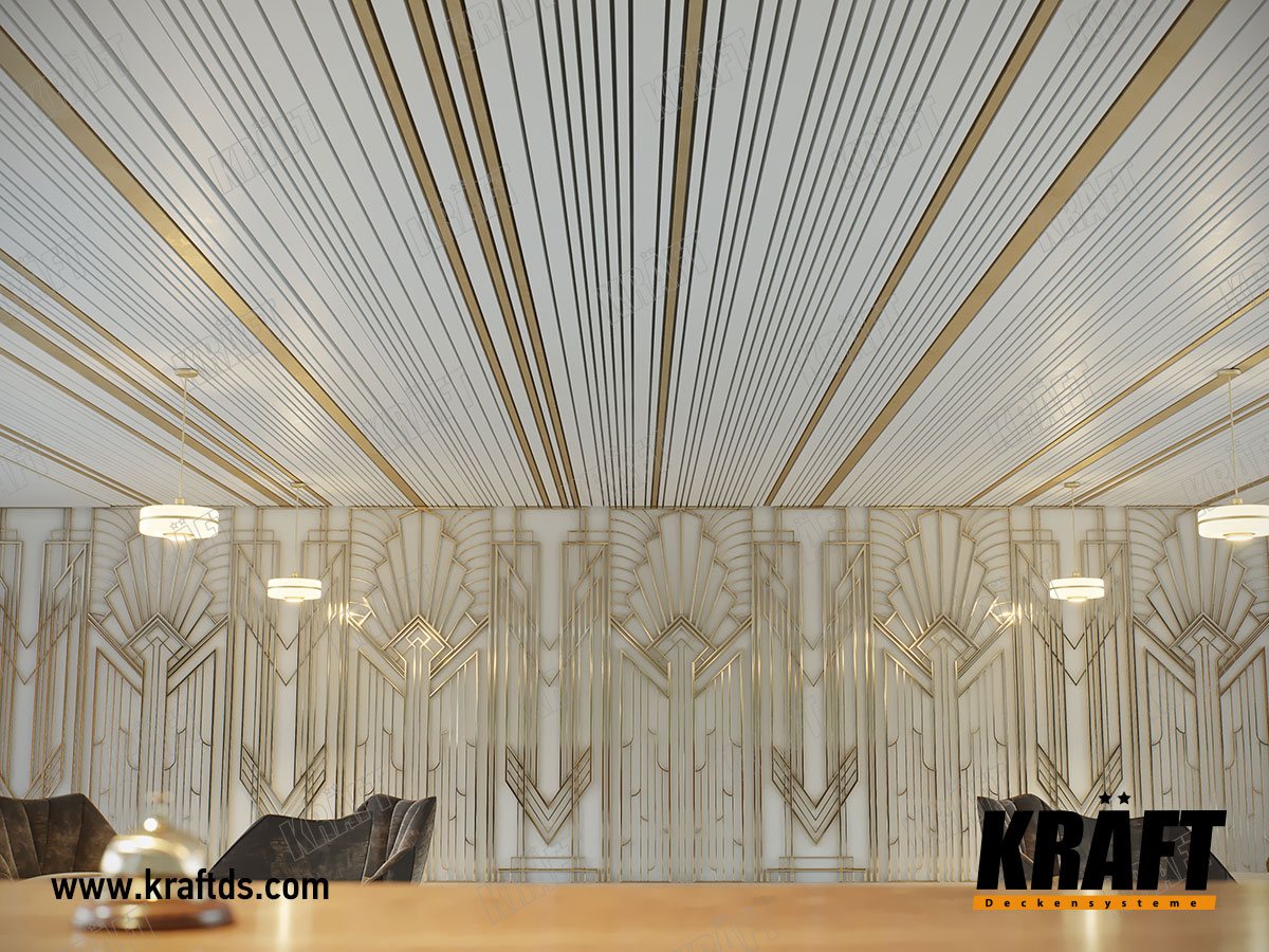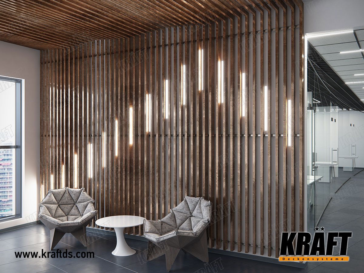 Using different lengths and pitch, the rails can be created from the seemingly standard slats to create an individual ceiling design in the room. And to support the pattern on the ceiling to make a smooth transition to the walls.