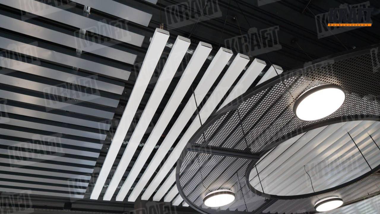 Metal slats in various colors and customizable formats open up endless design possibilities. As light interacts with the ceiling’s geometry, it creates soft, diffused illumination — enhancing a cozy or energetic atmosphere depending on the concept.