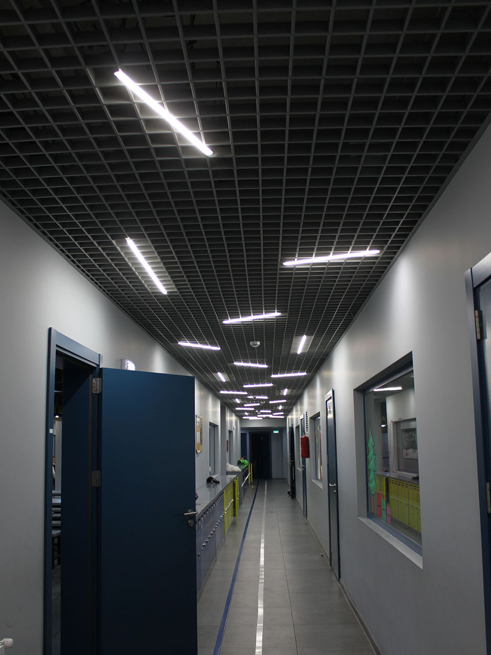Integrated into open cell ceilings. The luminaire repeats the shape of the cells, ensuring even light distribution across the ceiling surface.
