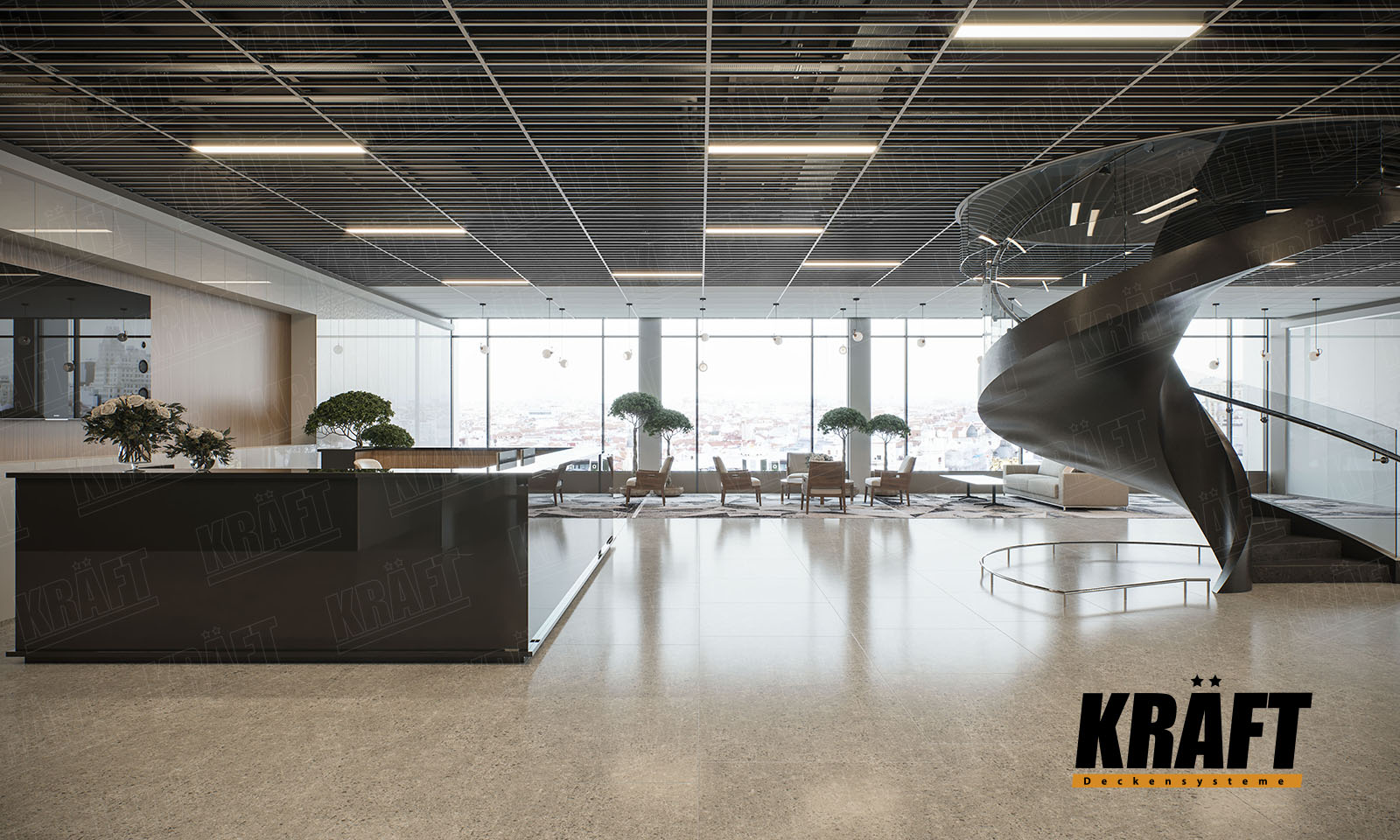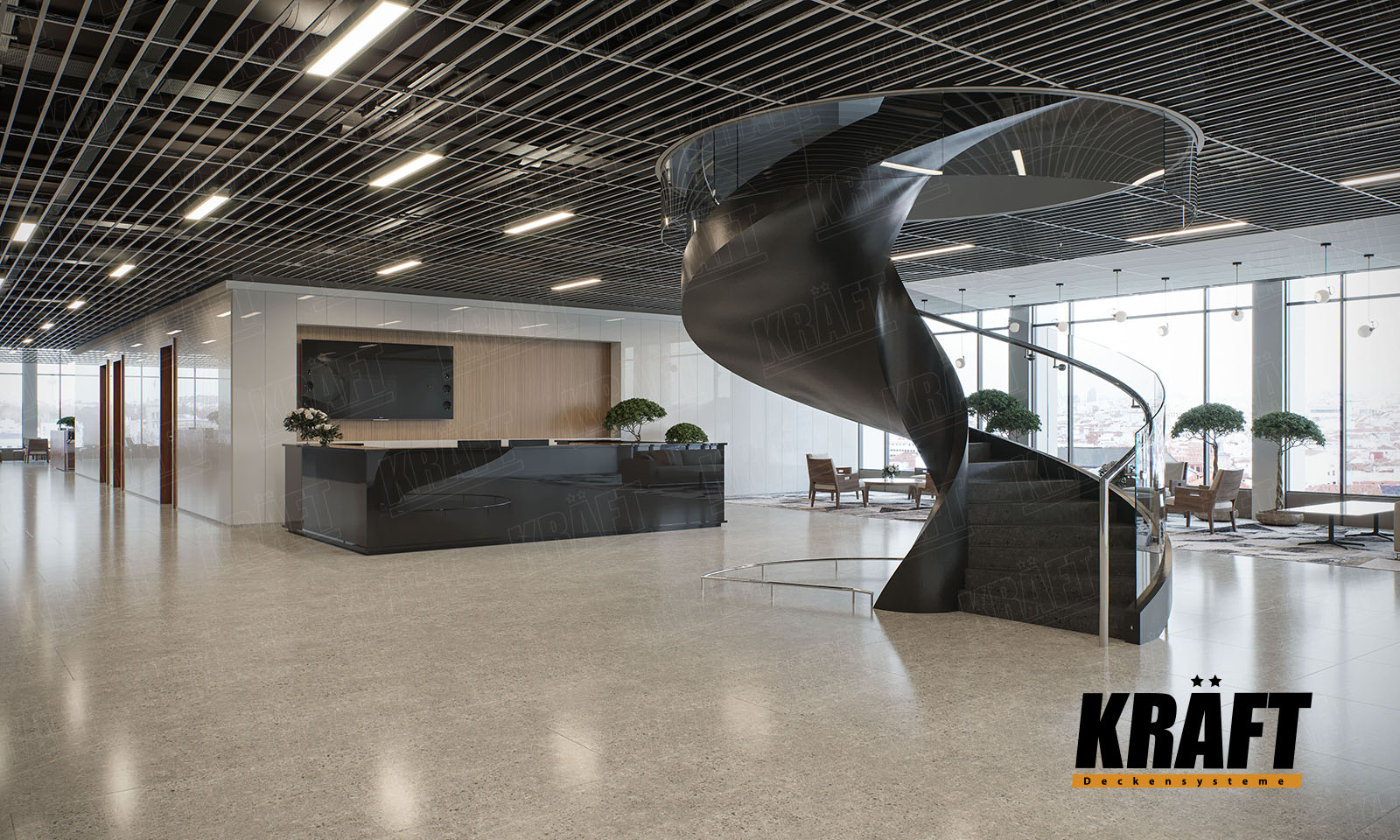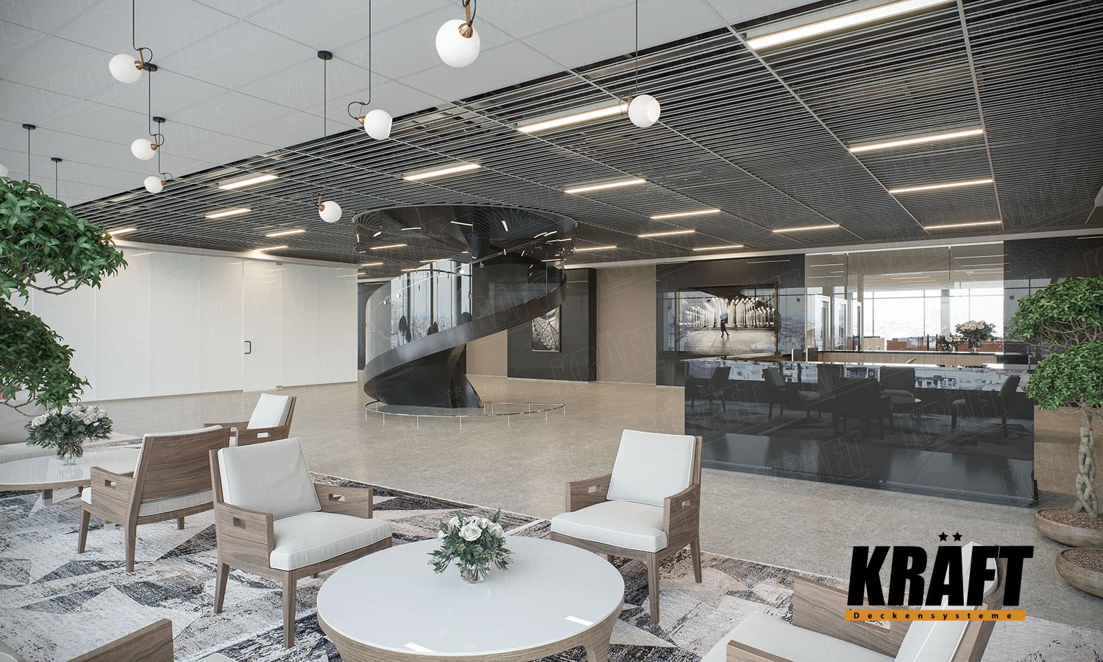 But it only seems. If desired, a suspended ceiling can be made from a T-profile, which will look stylish and modern. On the main longitudinal (3,600 mm) KRAFT T-profiles, locks for the transverse guides are located every 150 mm. Therefore, using the guides of 1200 mm or 600 mm, you can make a ceiling that looks like something in between a grillato ceiling and a  cube-shaped rail ceiling.