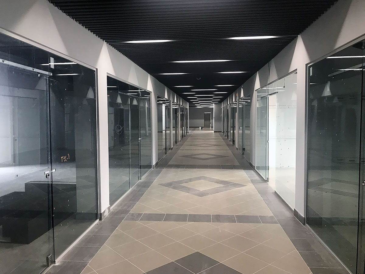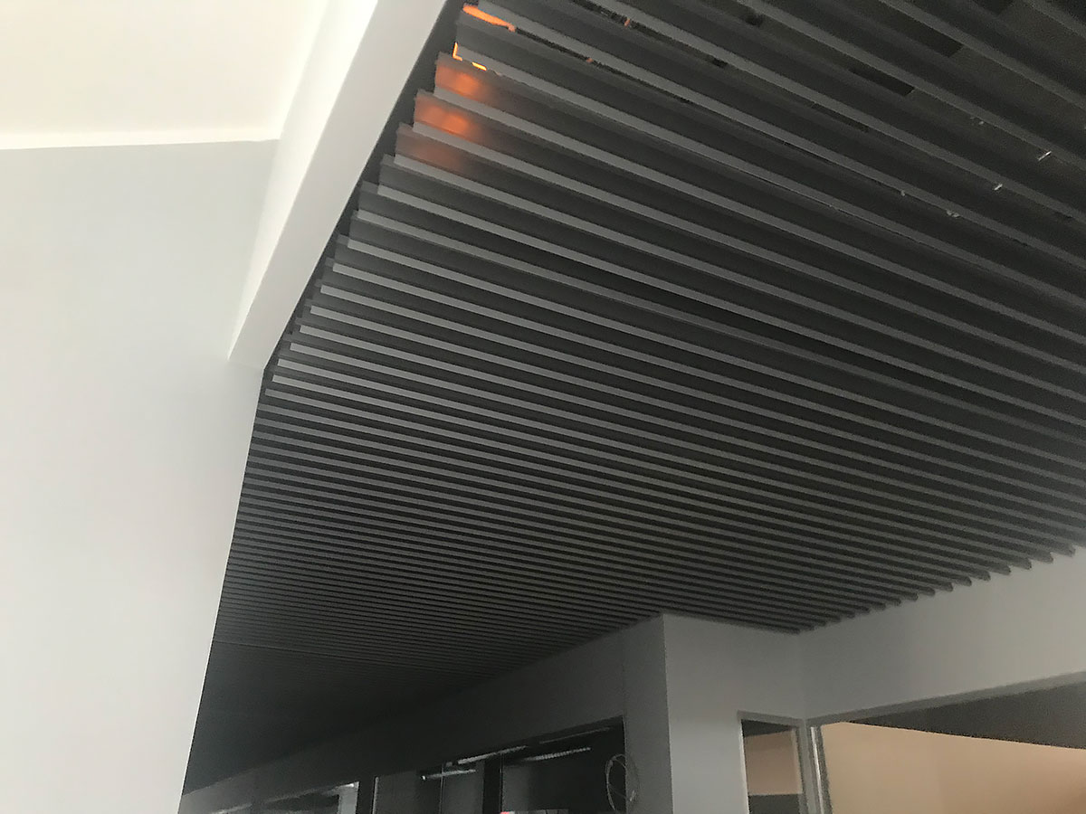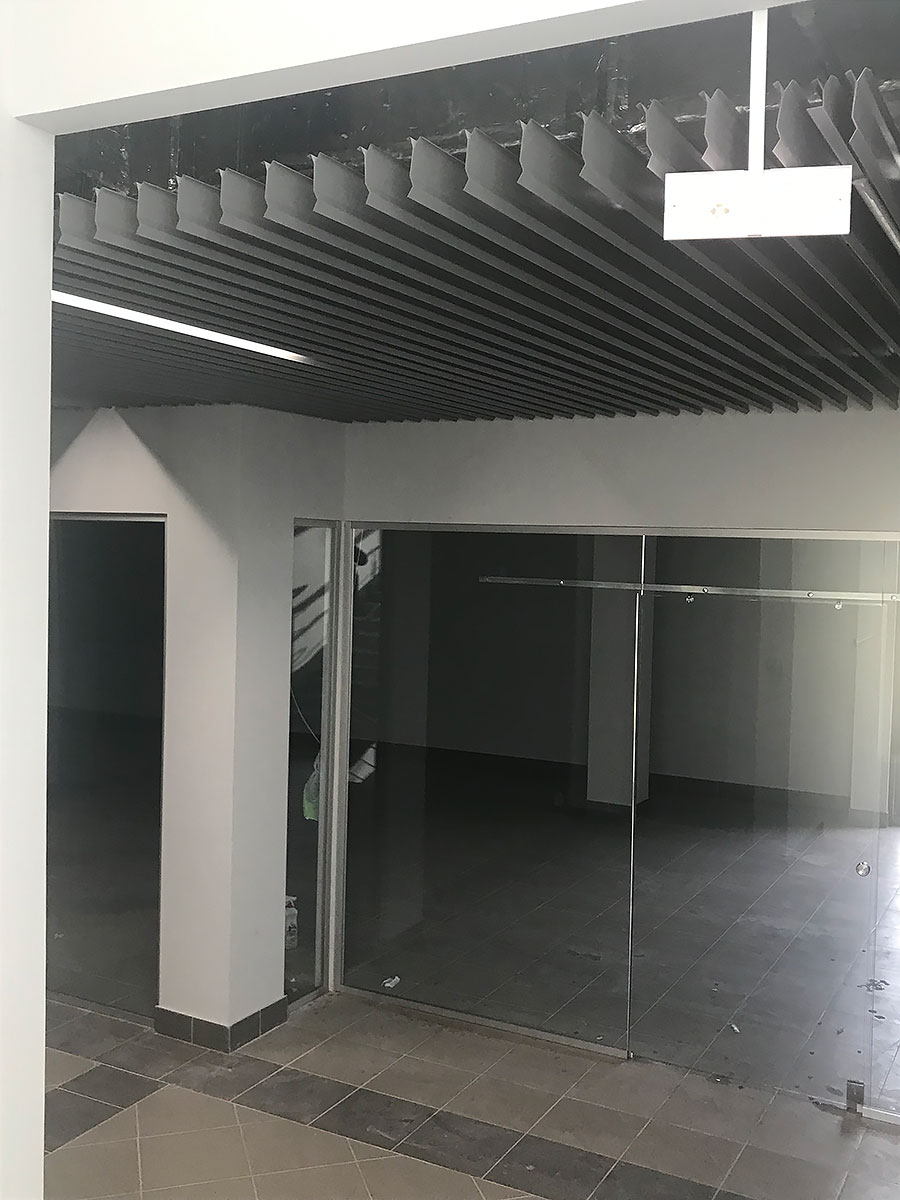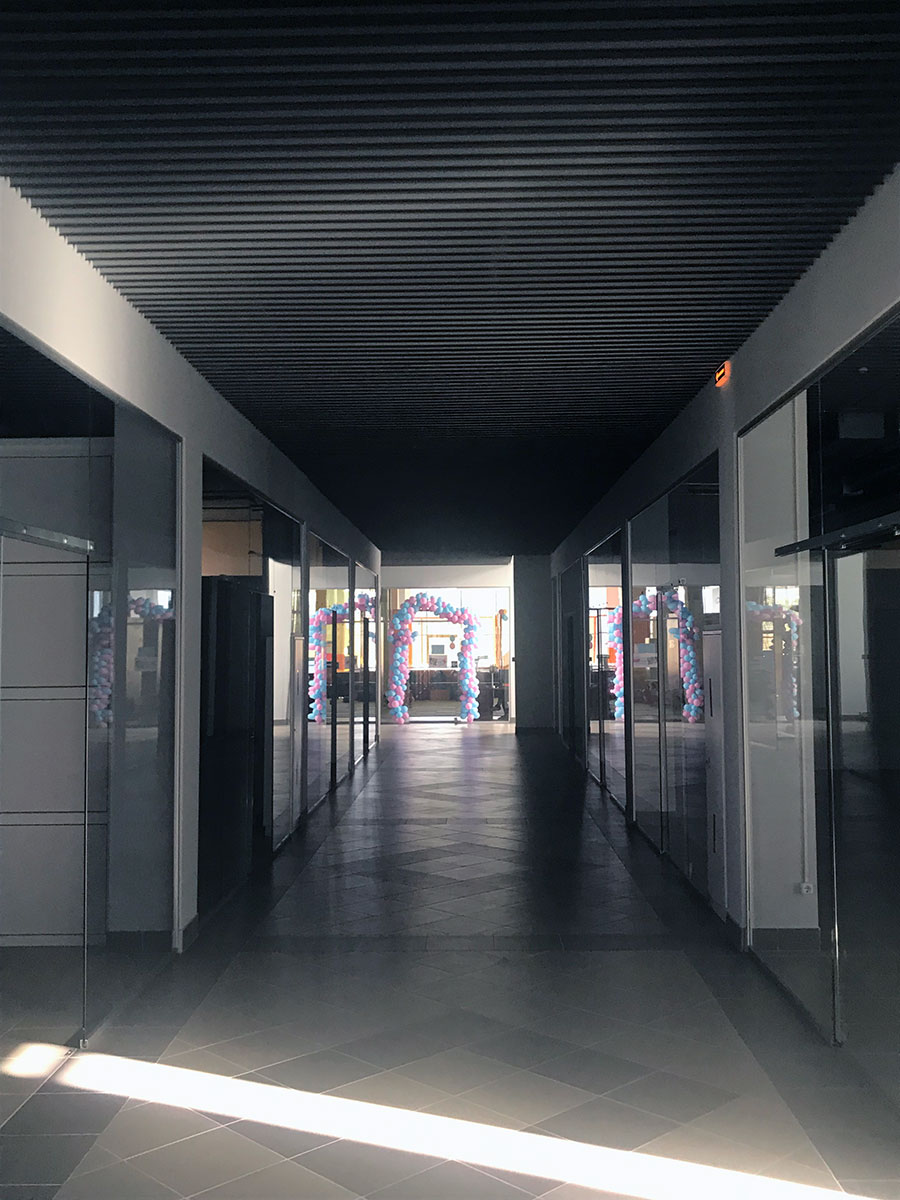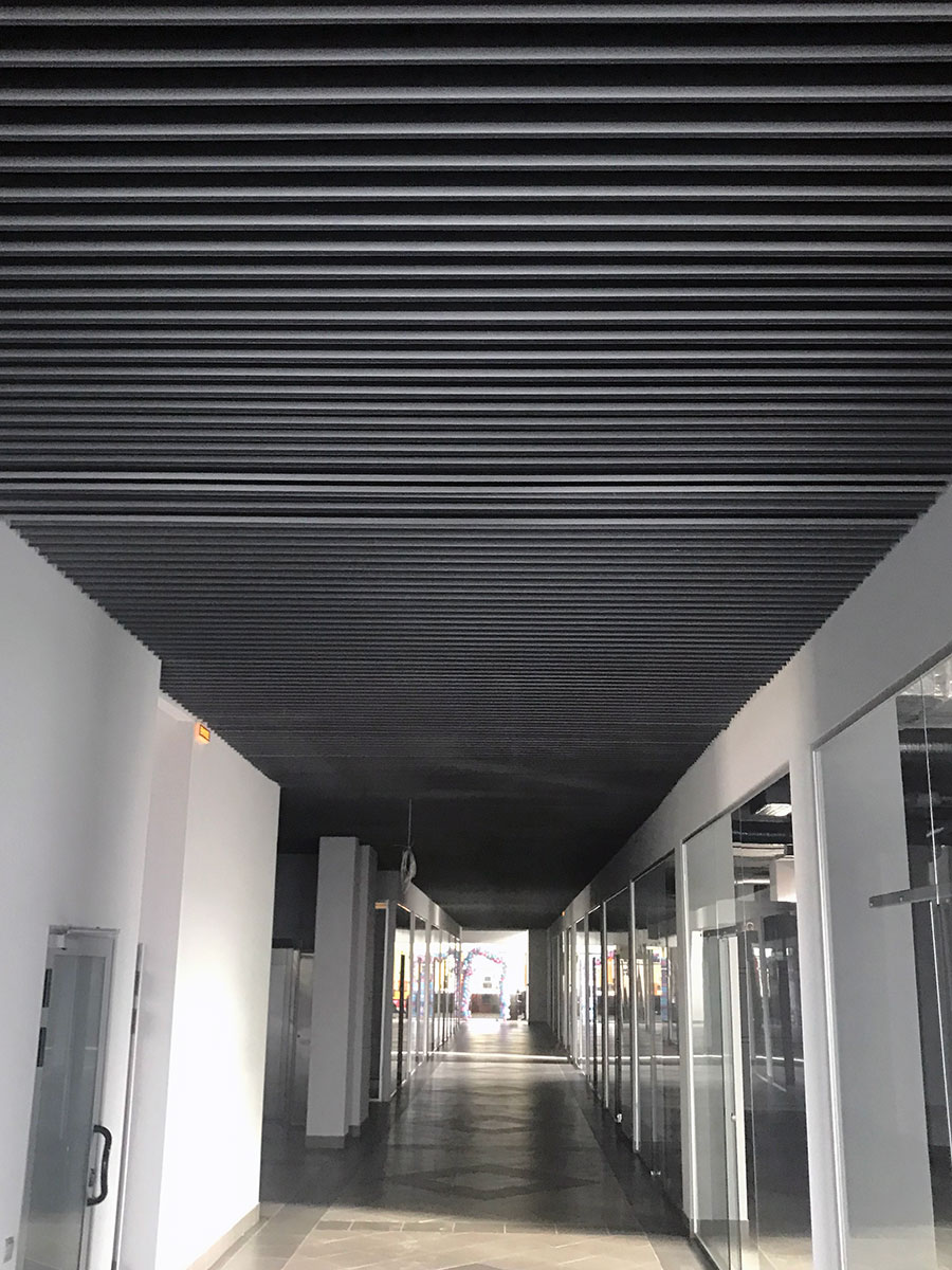 For the walkways and corridors of the mall, the KRAFT plate-shaped rail with a height of 100 mm and a pitch of 104 mm in black with an angled bend of the end was chosen as the ceiling. The bend of the rail is designed to increase the overlapping area of ​​the ceiling and the ceiling itself and give it additional volume. As you can see in the photo, in the general array the rail looks uniform and perfectly overlaps the communications under the ceiling. Installation and dismantling of the rack ceiling is one of the most simple, therefore, access to communications is quite simple. In addition, such a ceiling does not interfere with the operation of smoke removal and fire extinguishing systems.
