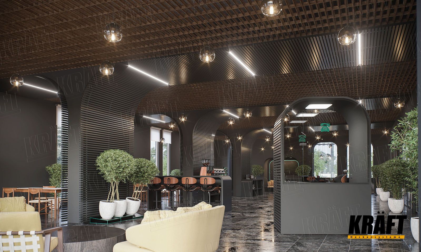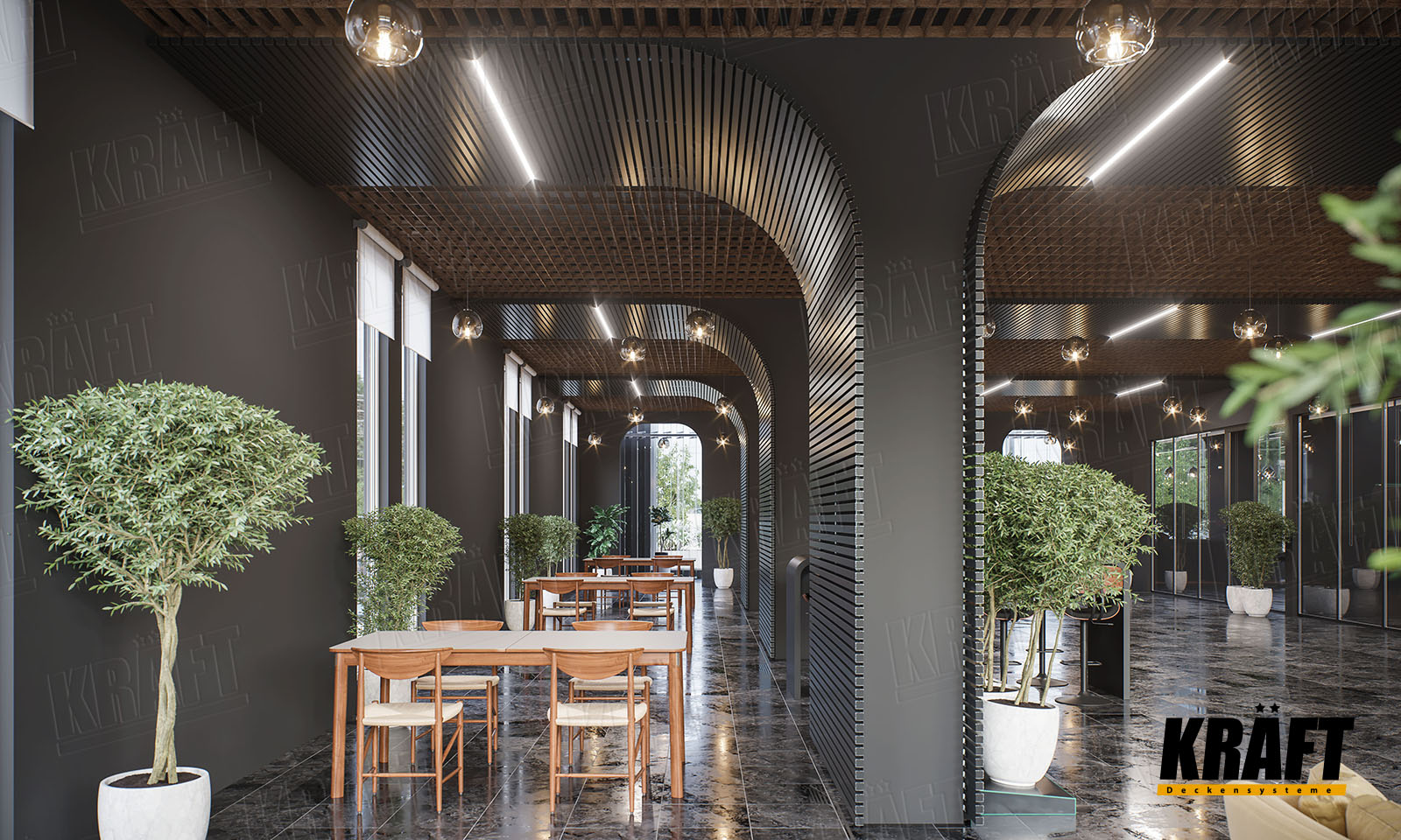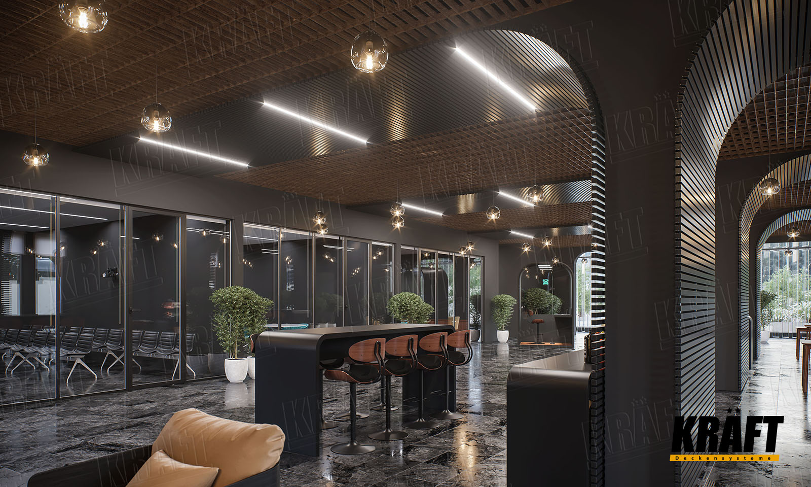 KRAFT ceilings open up creative possibilities for architects and designers. They offer the freedom to combine style, comfort, and innovation — shaping spaces that are not only functional but truly inspiring.