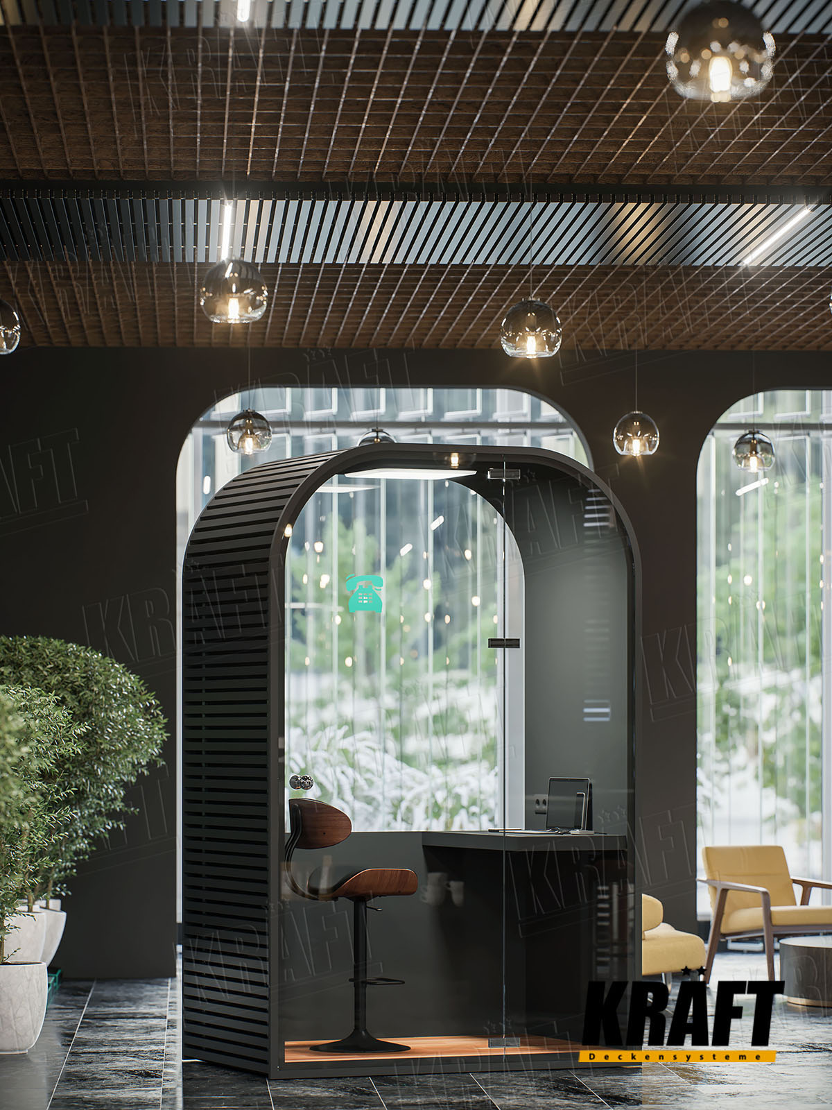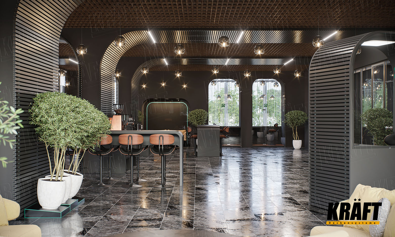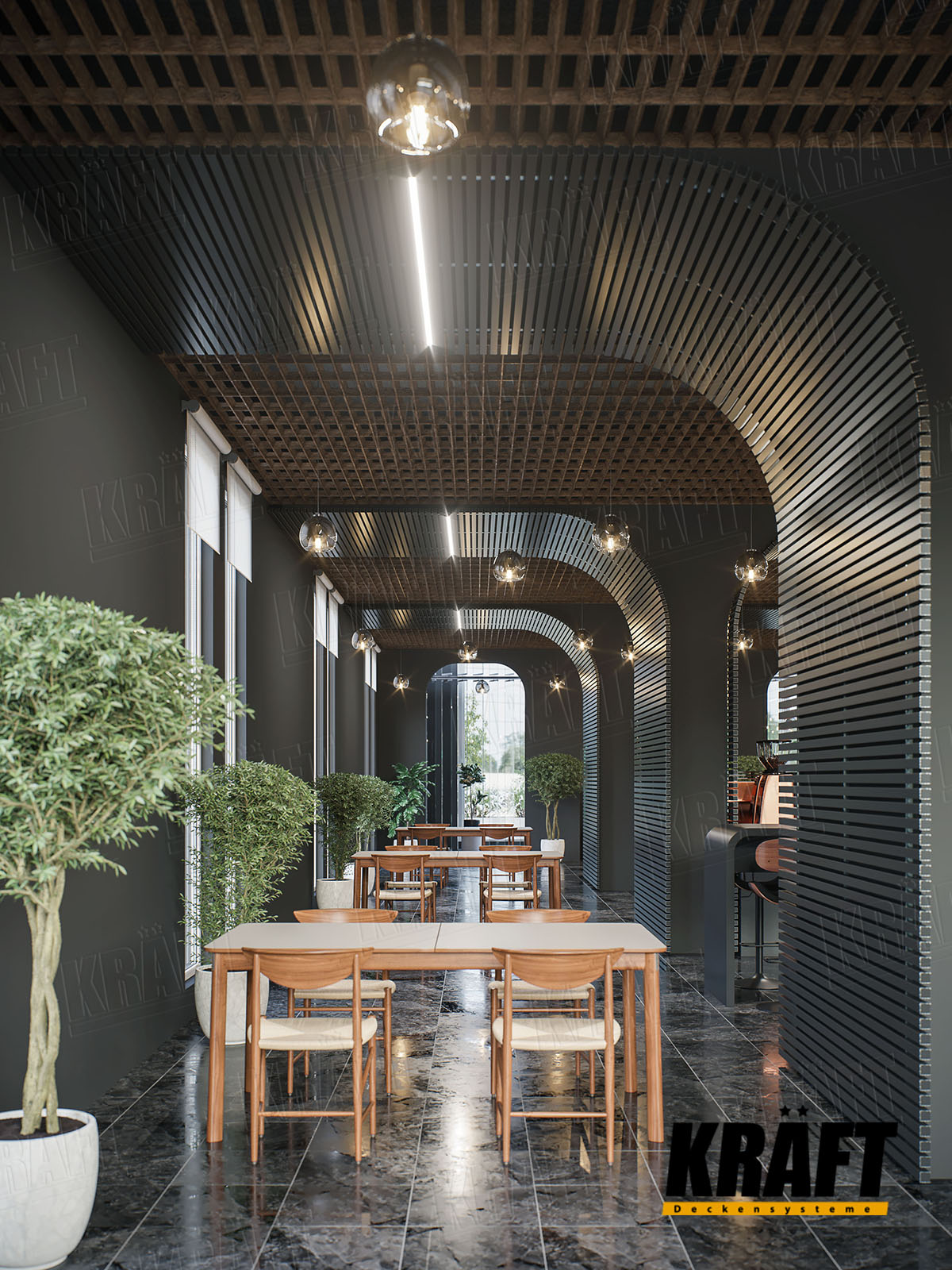 KRAFT ceilings open up creative possibilities for architects and designers. They offer the freedom to combine style, comfort, and innovation — shaping spaces that are not only functional but truly inspiring.