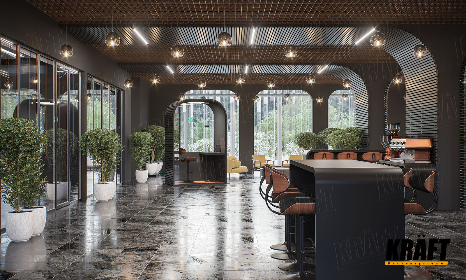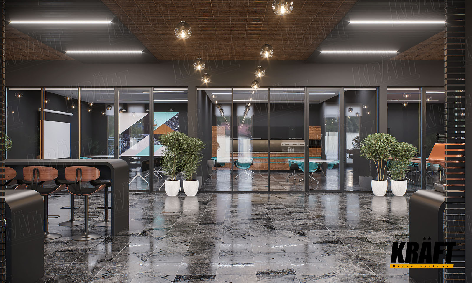 This design concept was developed by the KRAFT team to showcase the potential of ceiling systems in business interiors.