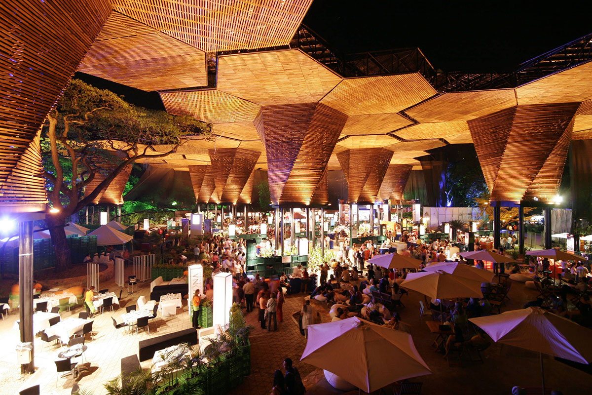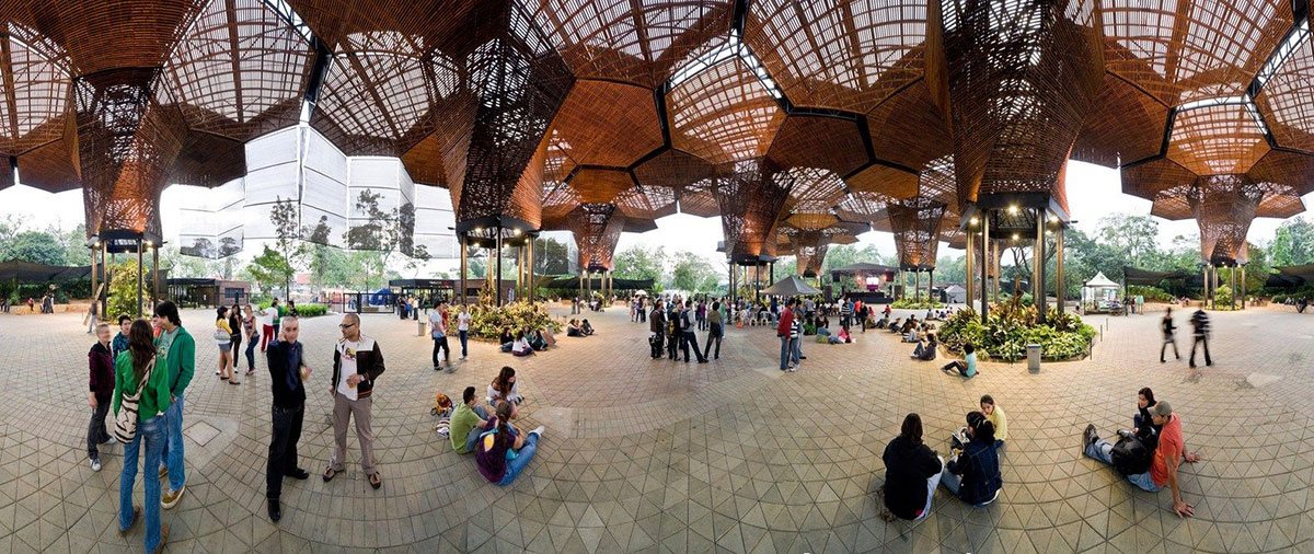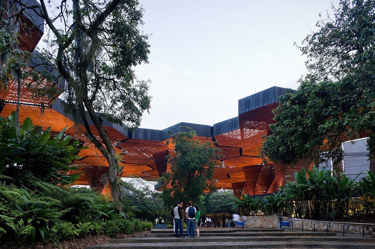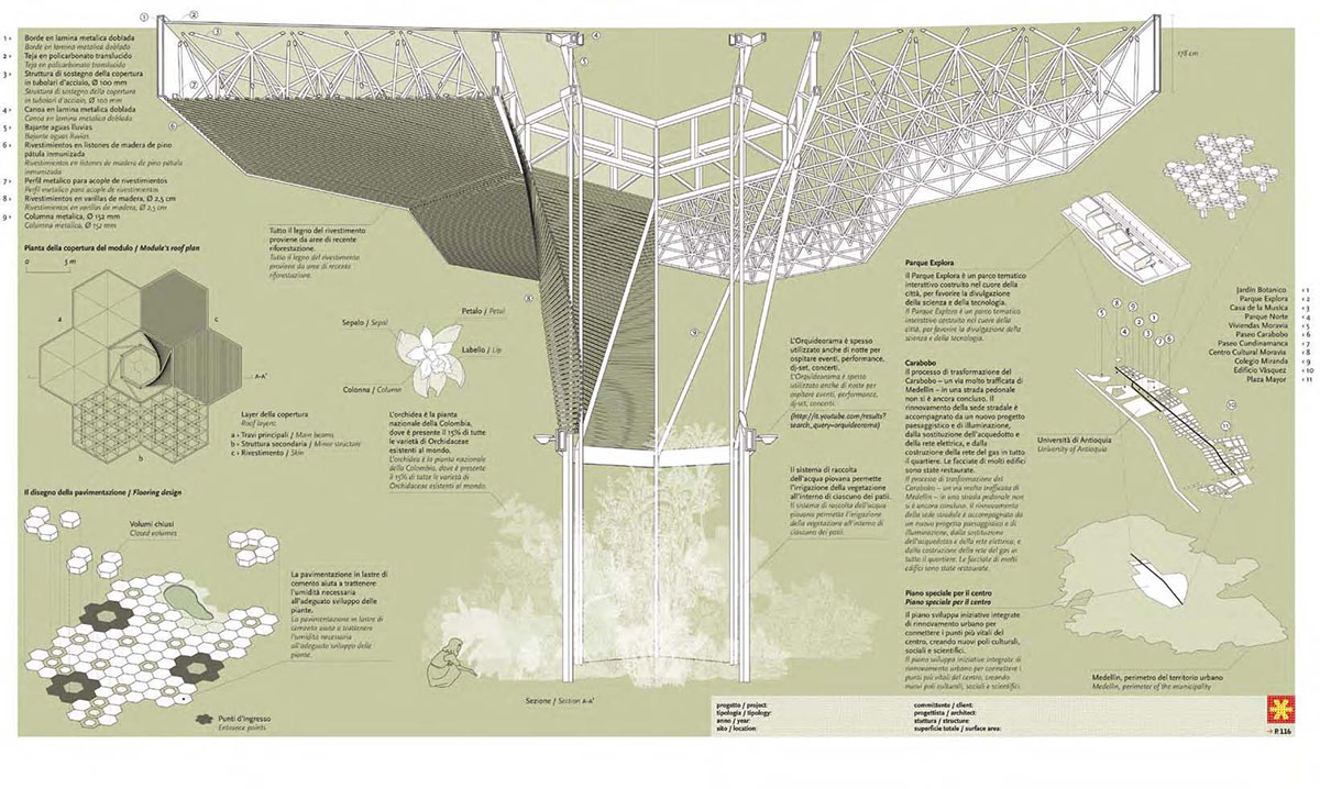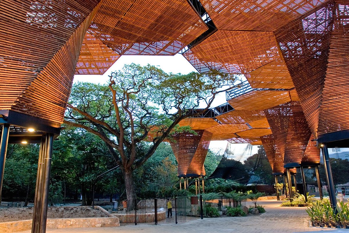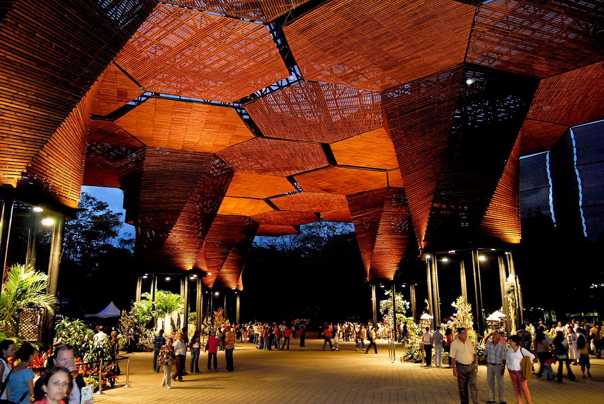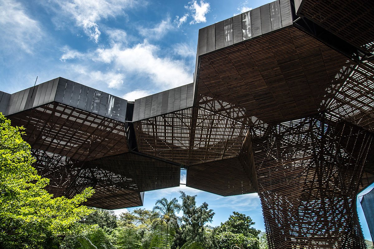 The architectural composition in the Botanical Garden Medellin (Colombia) will not leave indifferent any visitor. Giant orchids (Colombia's national flower) made of metal, polycarbonate and wood are organically inscribed into the surrounding landscape complementing and expanding the surrounding space.