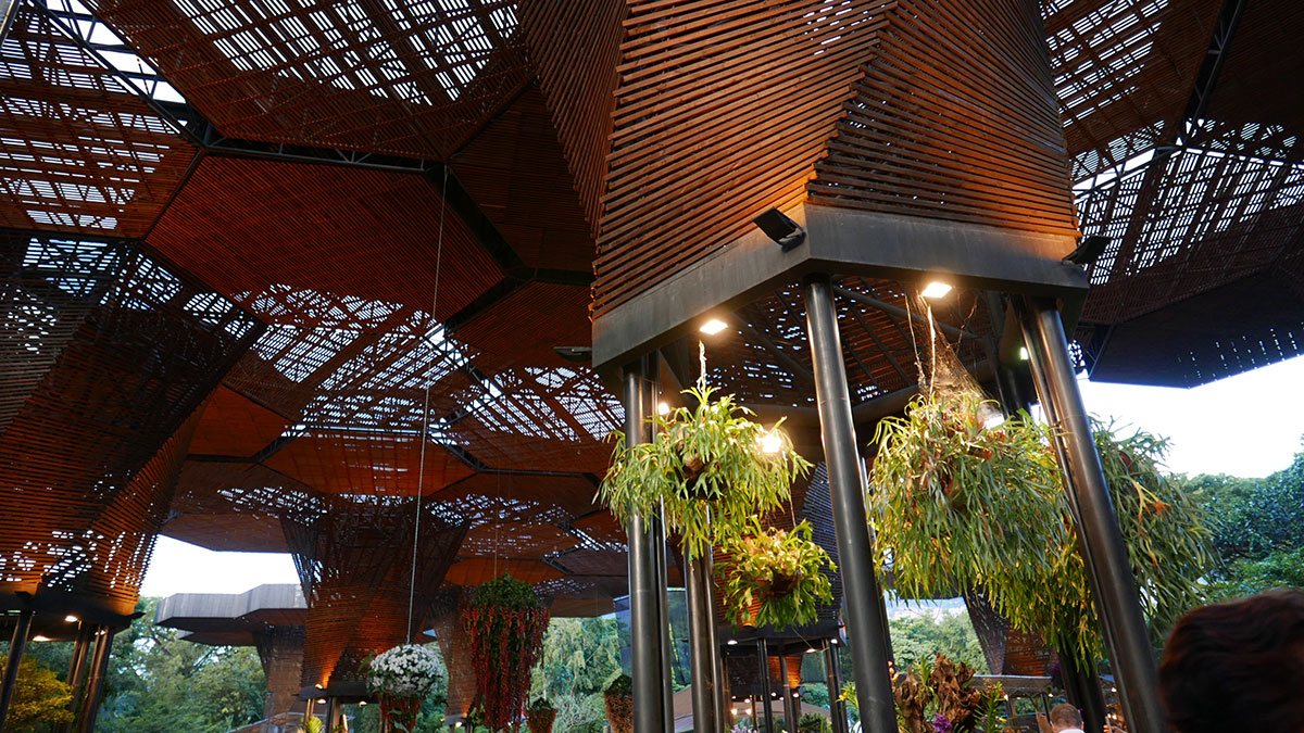 Orquideorama, Medellin – flowers from metal and linear strip ceiling