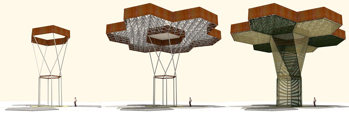 The structure consists of separate modules with six supporting columns and hexagonal "petals". Each structure forms a kind of patio with various plants and flowers at the bottom. Outside, the columns are lined with a wooden strip, and all necessary communications are laid inside.