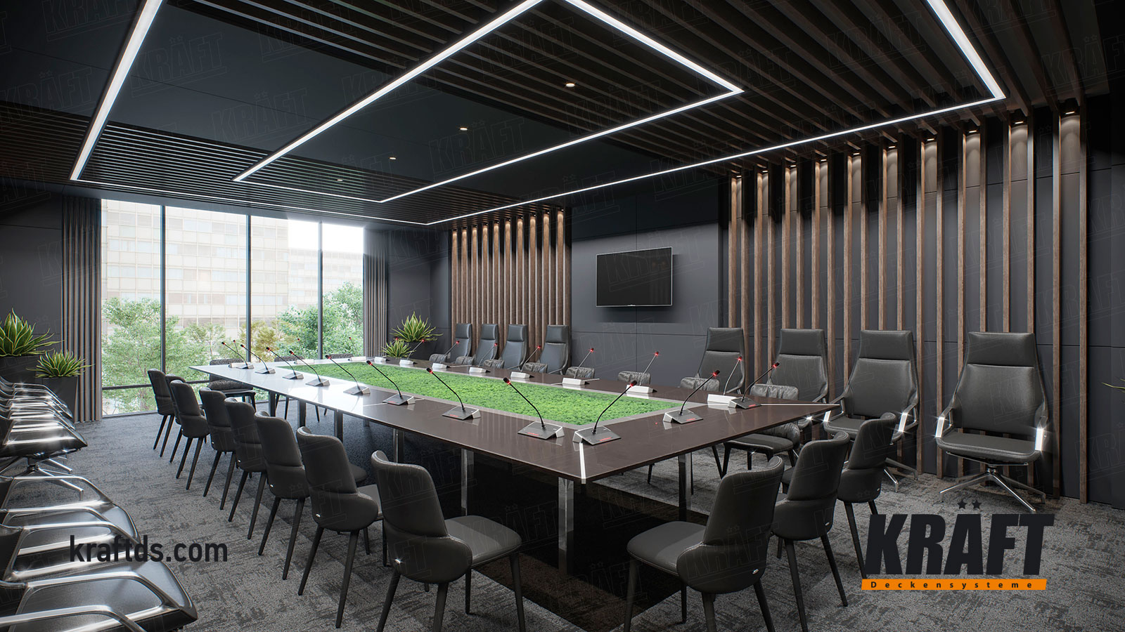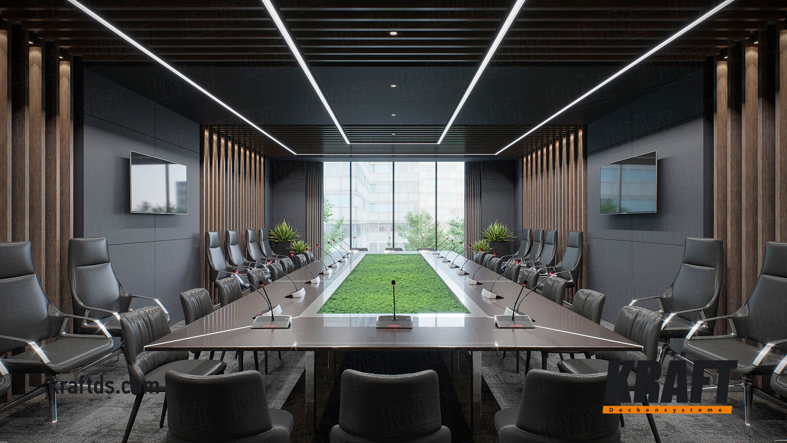 Now let's look at where and how exactly the cube-shaped rail was used. First, of course, the cube-shaped rail was used to equip the suspended ceiling. The rail on the ceiling is made of steel with a dark wood texture. The height of the rail is 105 mm, the pitch is 156 mm. It would seem that the step is large enough for such a ceiling height, but in this case it is justified by the fact that people most often sit in such a room, so the distance to the false ceiling will be greater than usual. The suspended ceiling is not made in a solid array. In the central part we see the usual painted ceiling, and sections with a cube-shaped rail are located where the main communications pass, in order to have easy access to their maintenance. You can also see gaps in the slatted ceiling for mounting the lighting system. The lighting system is located around the entire perimeter above the work surfaces. On the ceiling, the luminaires are mounted parallel to the rails and perpendicular to the gaps between them and are flush with the lower false ceiling.