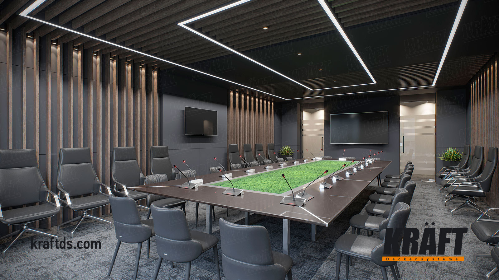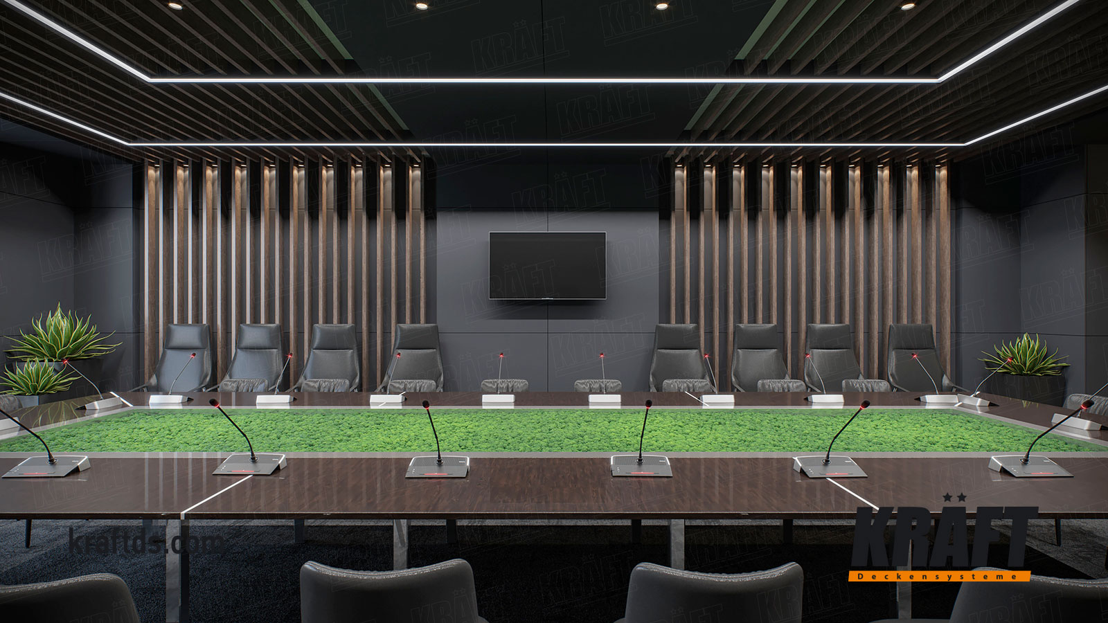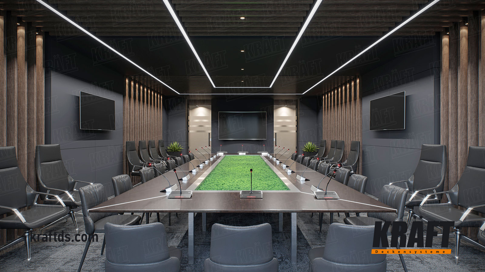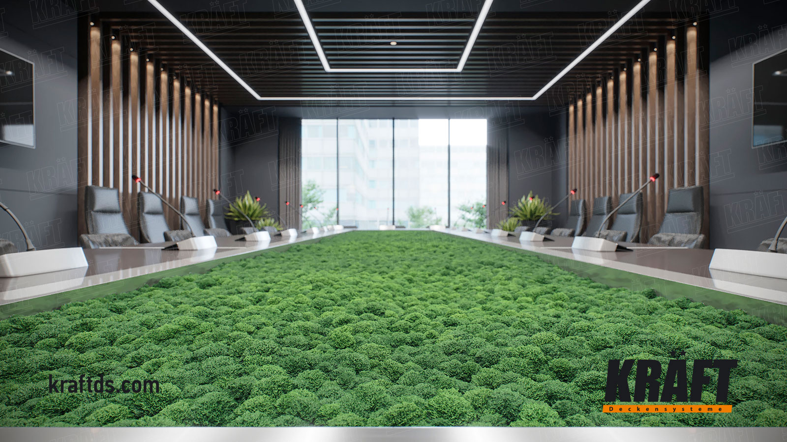 Conference rooms or meeting rooms often look business-like boring. Tables, chairs, microphones and other paraphernalia keep people from forgetting exactly where they are. But if a good designer has worked with such a room, then even a few elements can transform a dull room. In this case, the central element is a conference table with landscaping of stabilized moss. It would seem a trifle, but immediately it seems that you are holding a meeting somewhere on the lawn. Greenery is pleasing to the eye and, of course, serves as an inspiring element for people of creative professions. And to emphasize this impression, the designer decorated the walls with a KRAFT cube-shaped rail with a wood texture. And now the boring office space has literally turned into a wooden gazebo in nature. Agree, the sensations should be much more pleasant!
