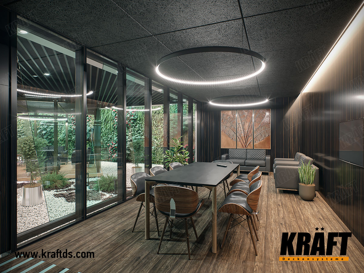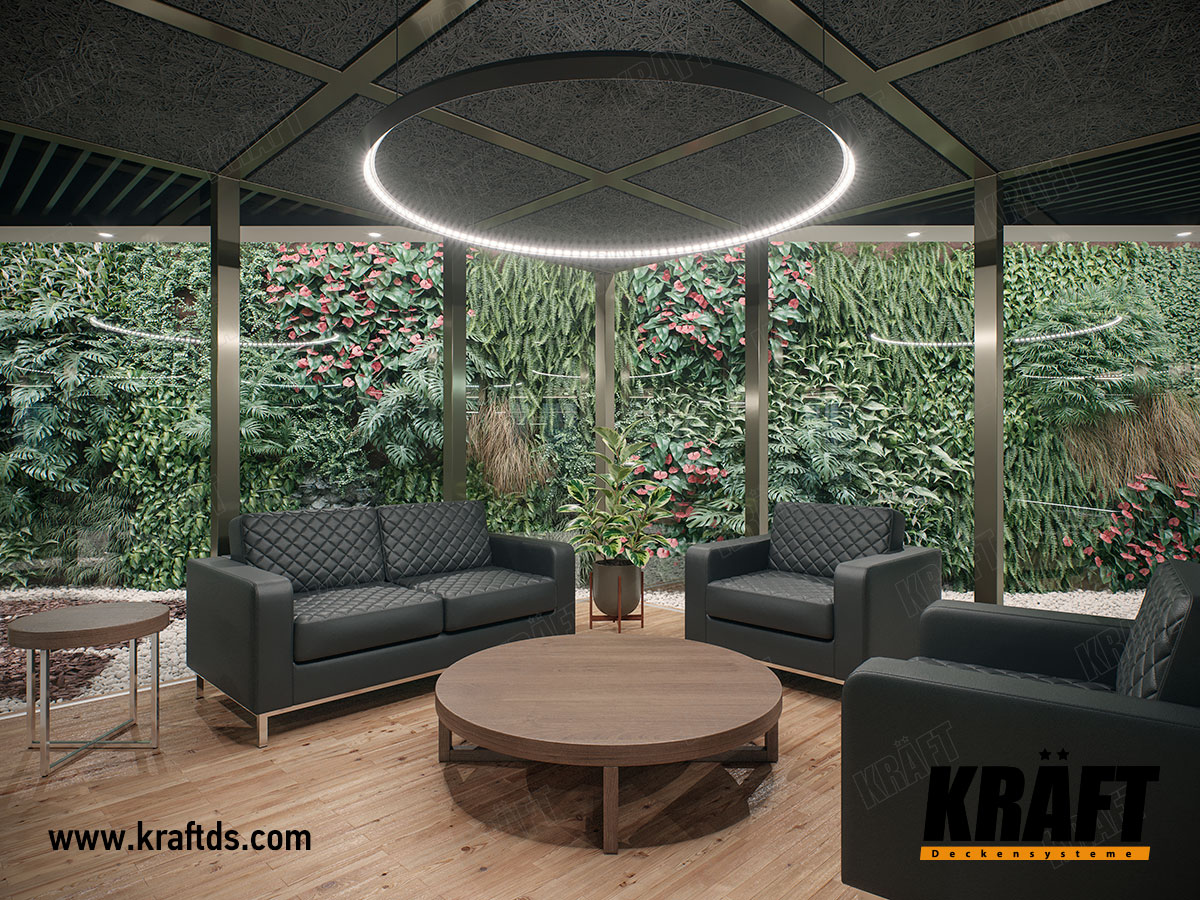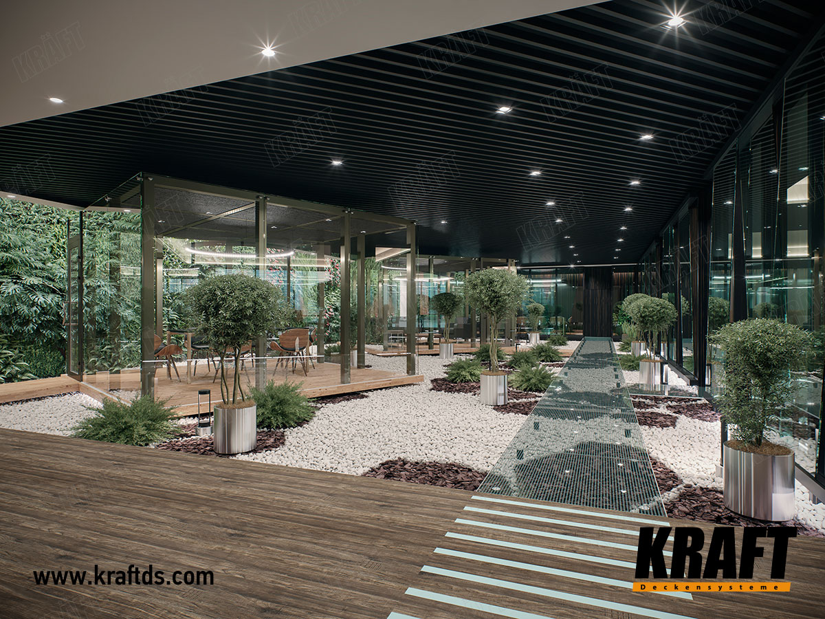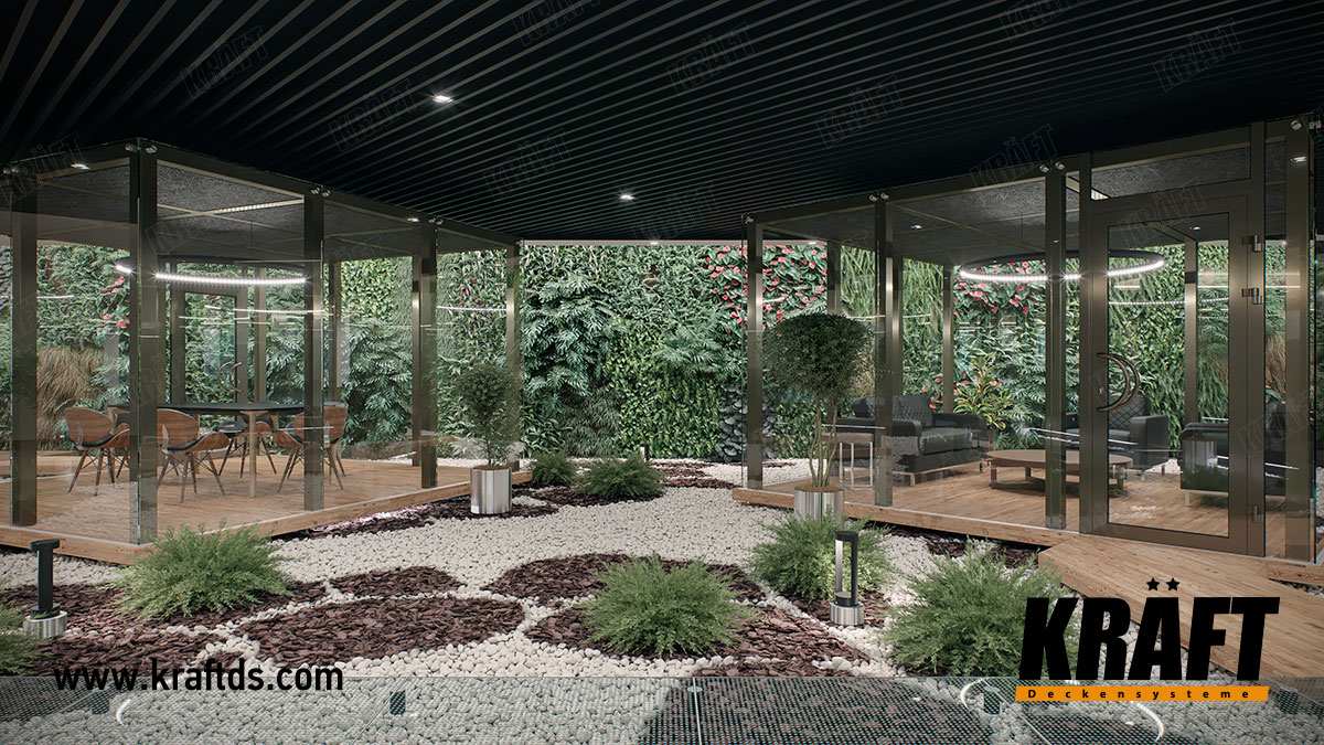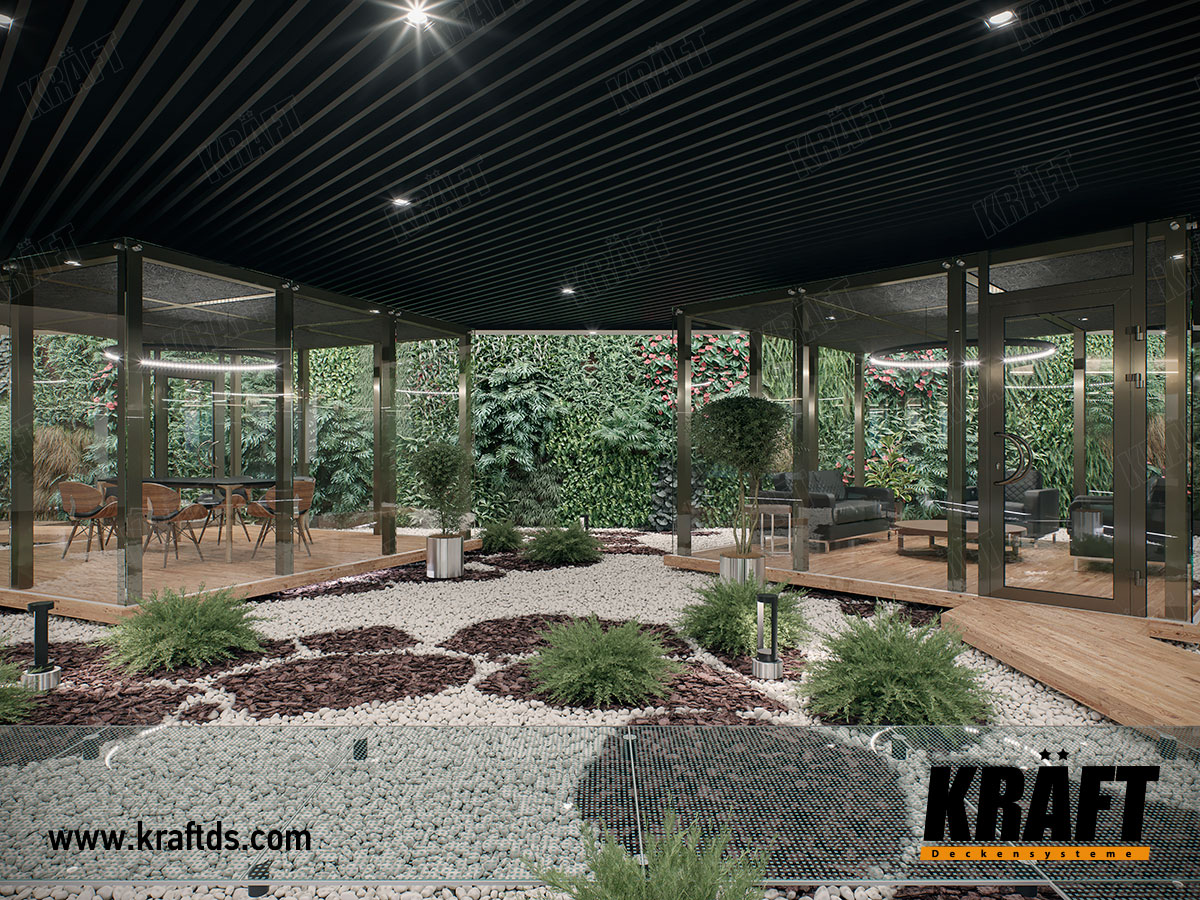 Designer suspended ceilings are an excellent tool for creating the right atmosphere in a property. The Greenwood restaurant with KRAFT cube-shaped rails suspended ceilings is an excellent illustration of the practical realization of such an idea.