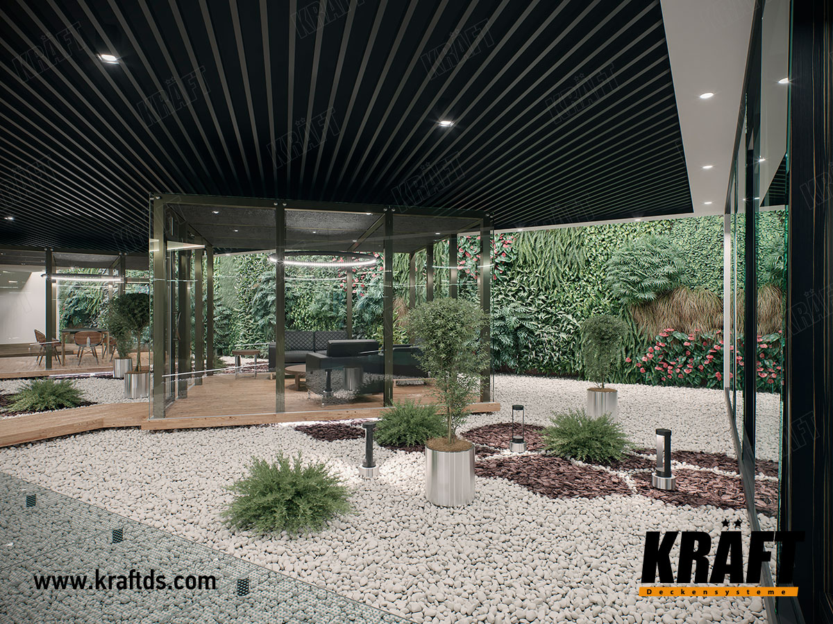 In the common area, one of the main conditions is fire safety, so the KRAFT cube-shaped rails ceiling with a height of 105 mm and a pitch of 100 mm was chosen. It does not interfere with fire extinguishing and ventilation systems and provides easy access to communications in the ceiling space.