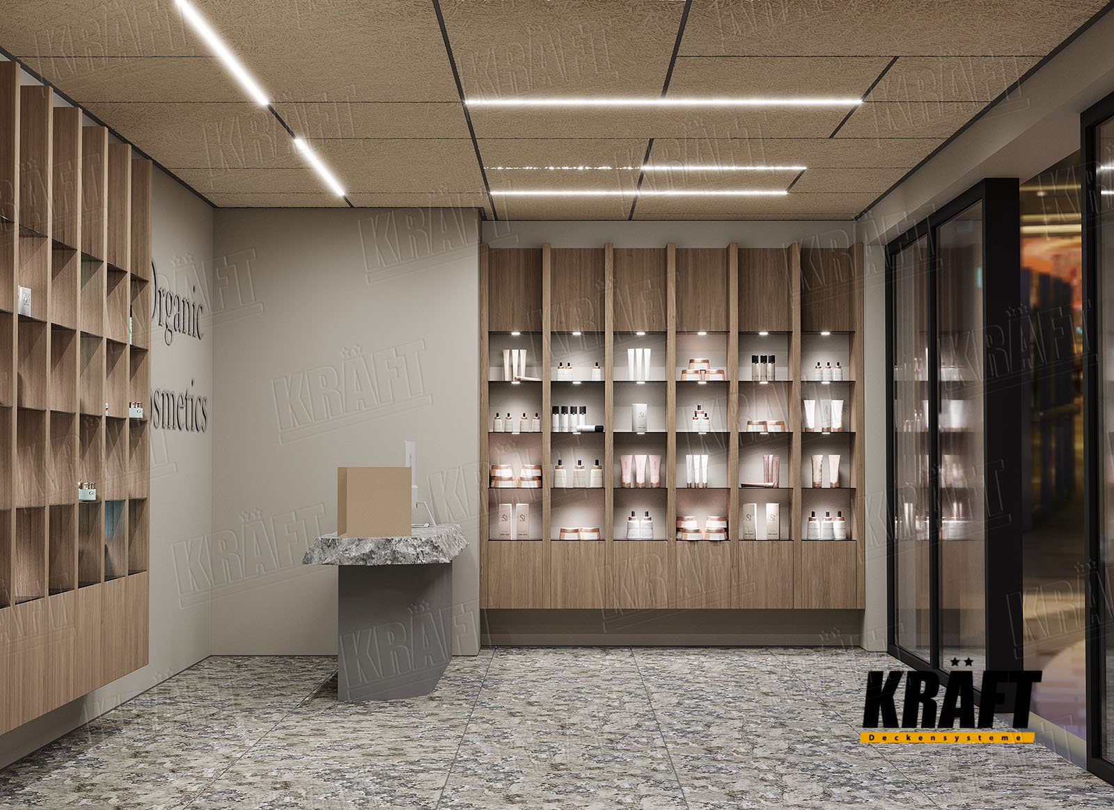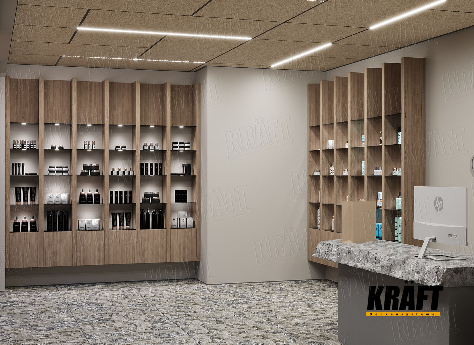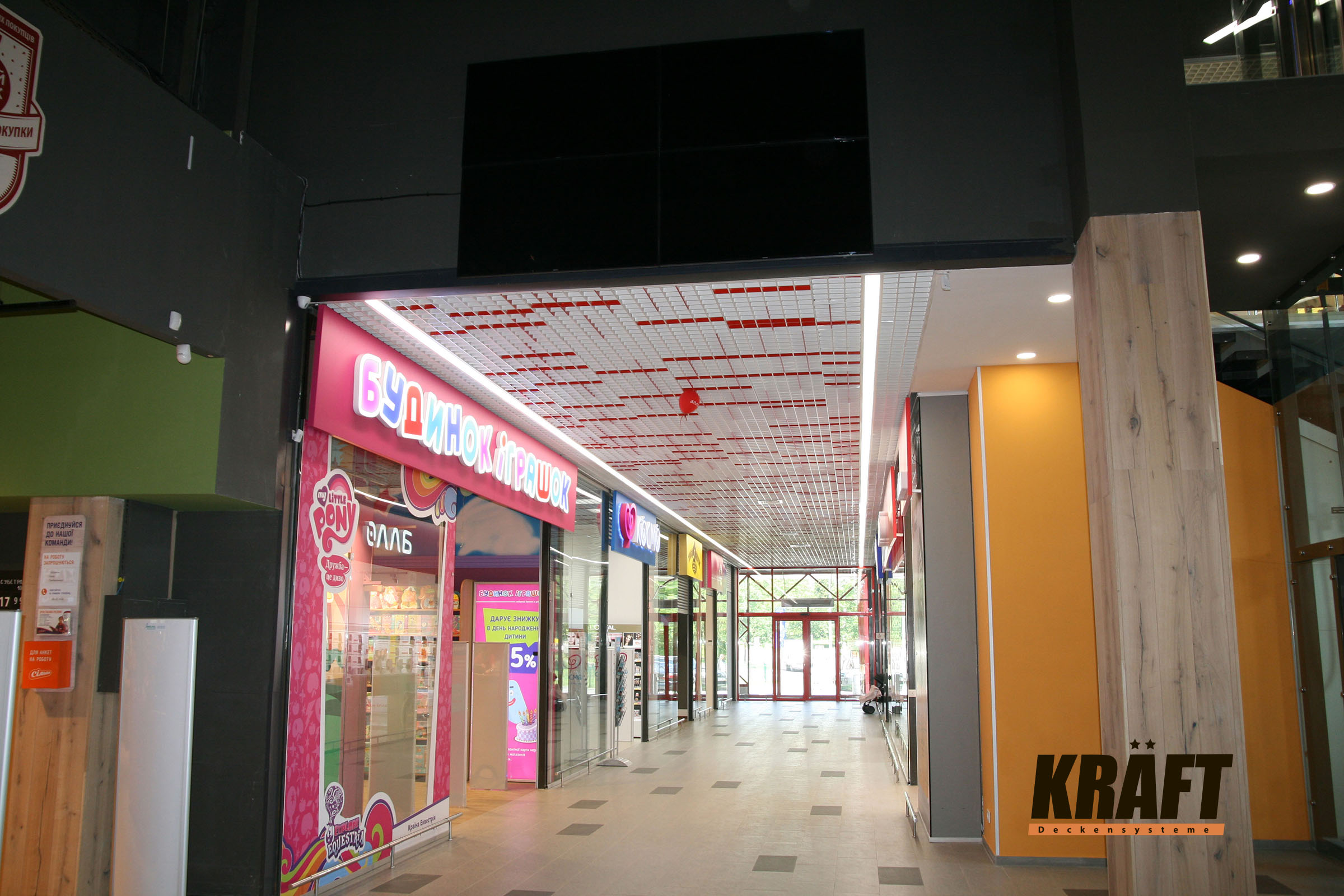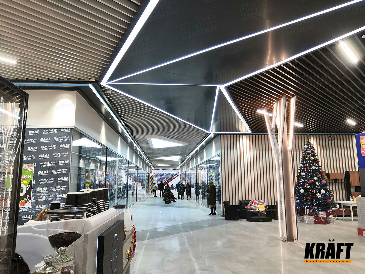 In this article, we will consider the main categories of commercial spaces: shopping malls, shops inside malls, and stand-alone retail stores. Please note that all recommendations concern the selection of KRAFT suspended ceilings exclusively for public areas — sales halls, galleries, lobbies, and passageways, not for back-of-house premises.
