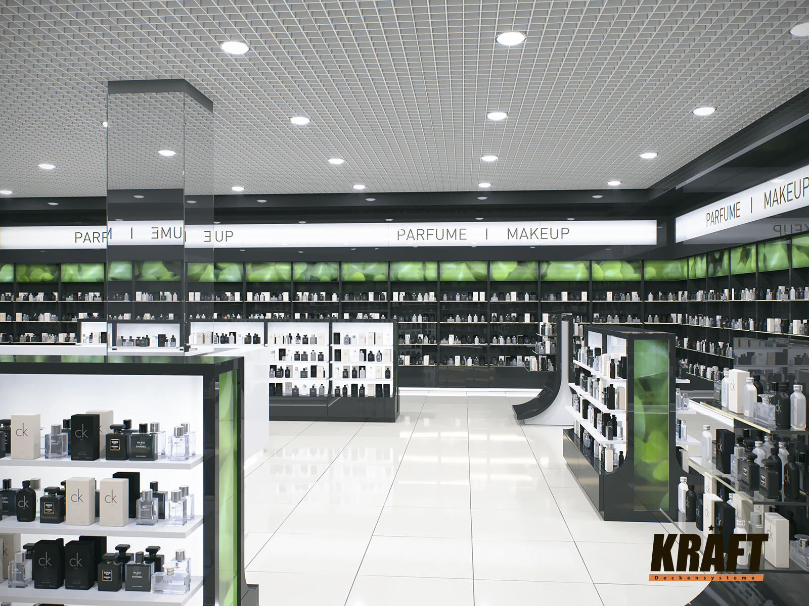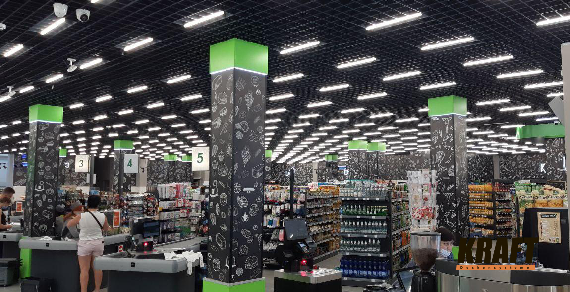 KRAFT suspended ceilings harmoniously combine stylish appearance and practicality. They are ideal for solving any task in the public areas of shops and shopping malls. Below, we will look at the features of using different types of KRAFT suspended ceilings, examples of their applications, and evaluate each based on a number of parameters using a 10-point scale.