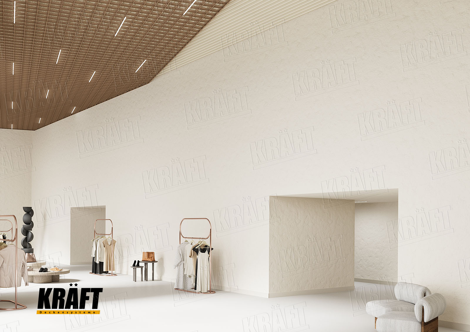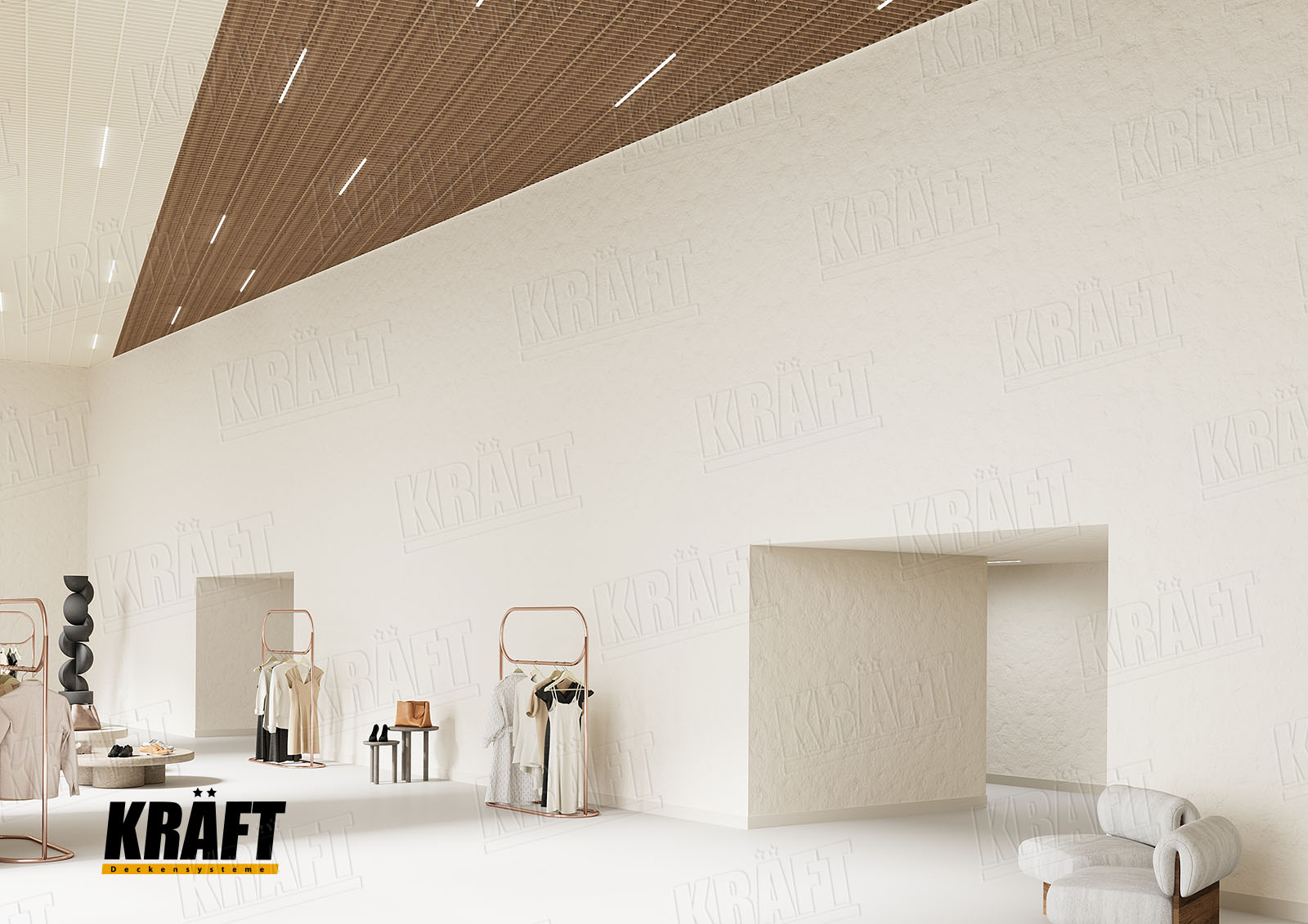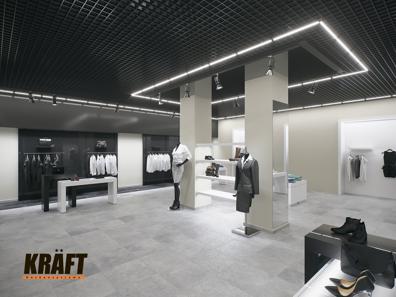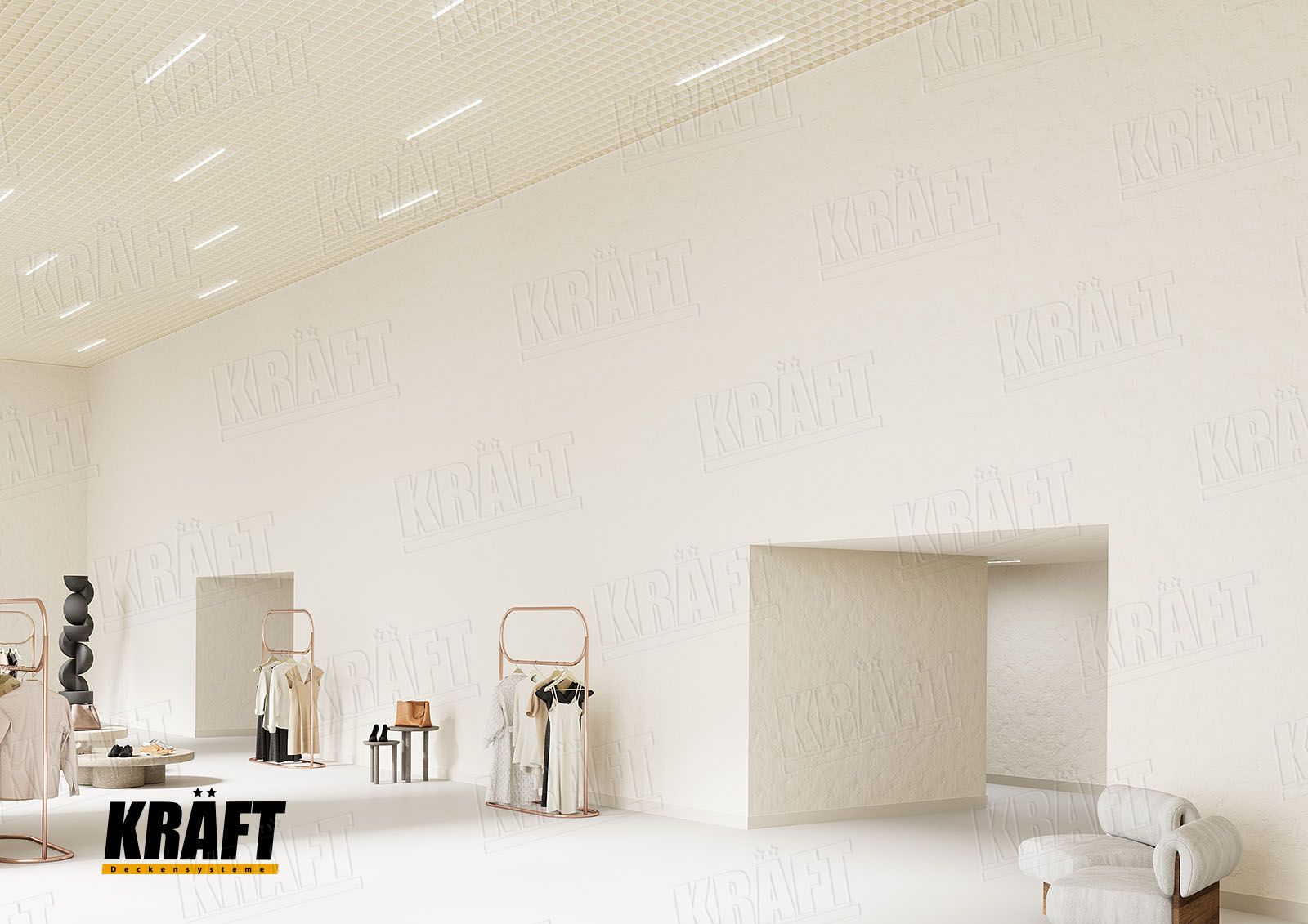 It is worth noting the possibility of combining different types of KRAFT suspended ceilings within a single interior. This approach not only helps to zone the space and highlight specific areas but also efficiently solves technical problems. For example, the main retail area can feature a transparent linear strip ceiling or open cell ceiling, ensuring proper ventilation and fire safety, while the cashier area or fitting rooms can have an acoustic ceiling to reduce noise. KRAFT Mesh expanded metal mesh panels are perfect for decorative inserts, creating suspended islands, or unique design accents. A well-thought-out combination of different systems allows the shop interior to be not only functional but also impressive, meeting modern requirements for safety and comfort.