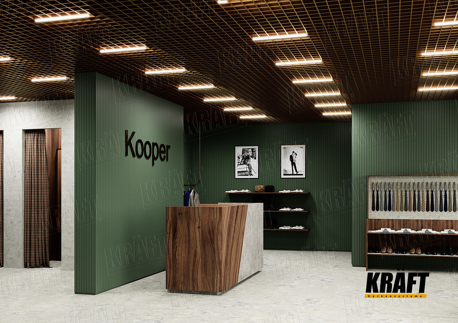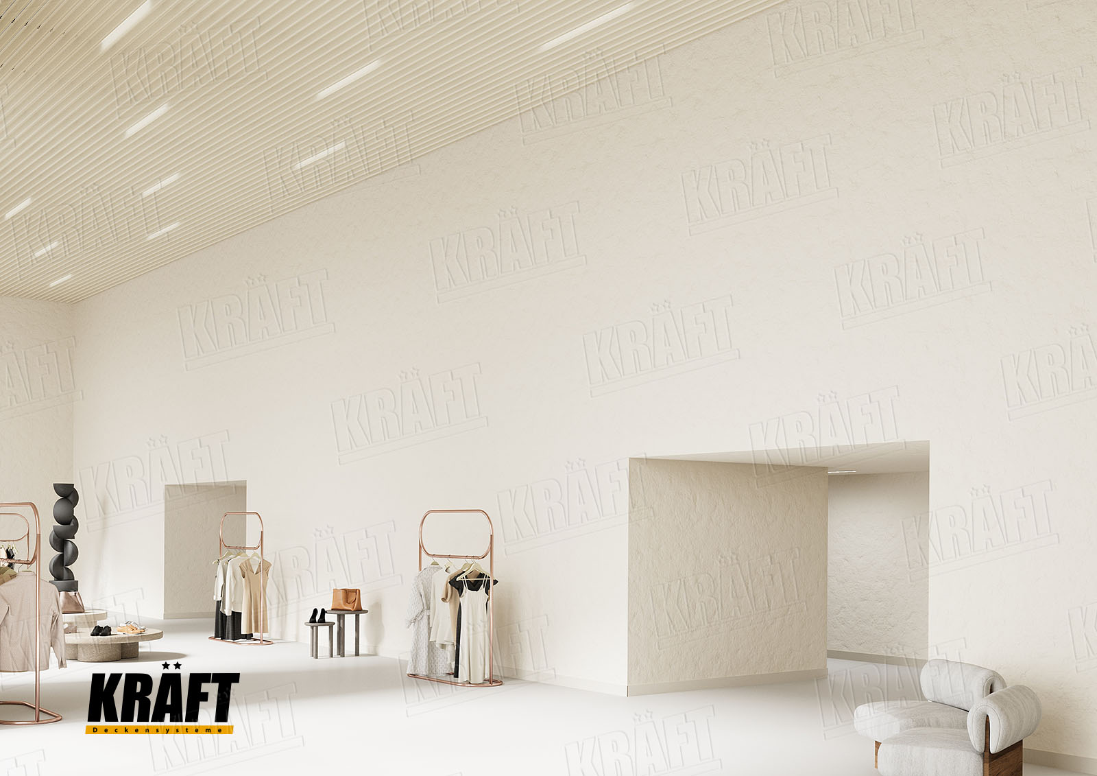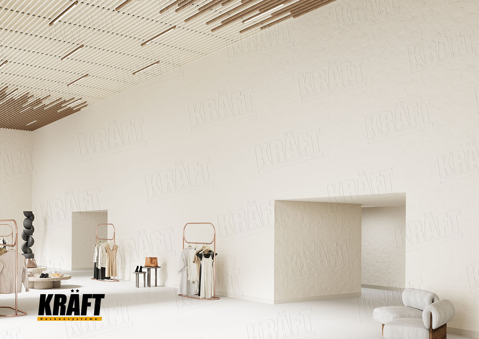 It is worth noting the possibility of combining different types of KRAFT suspended ceilings within a single interior. This approach not only helps to zone the space and highlight specific areas but also efficiently solves technical problems. For example, the main retail area can feature a transparent linear strip ceiling or open cell ceiling, ensuring proper ventilation and fire safety, while the cashier area or fitting rooms can have an acoustic ceiling to reduce noise. KRAFT Mesh expanded metal mesh panels are perfect for decorative inserts, creating suspended islands, or unique design accents. A well-thought-out combination of different systems allows the shop interior to be not only functional but also impressive, meeting modern requirements for safety and comfort.