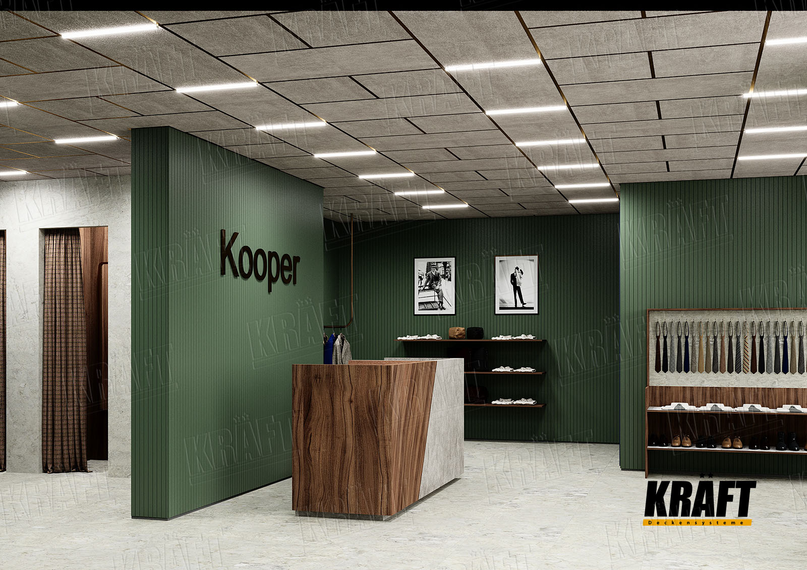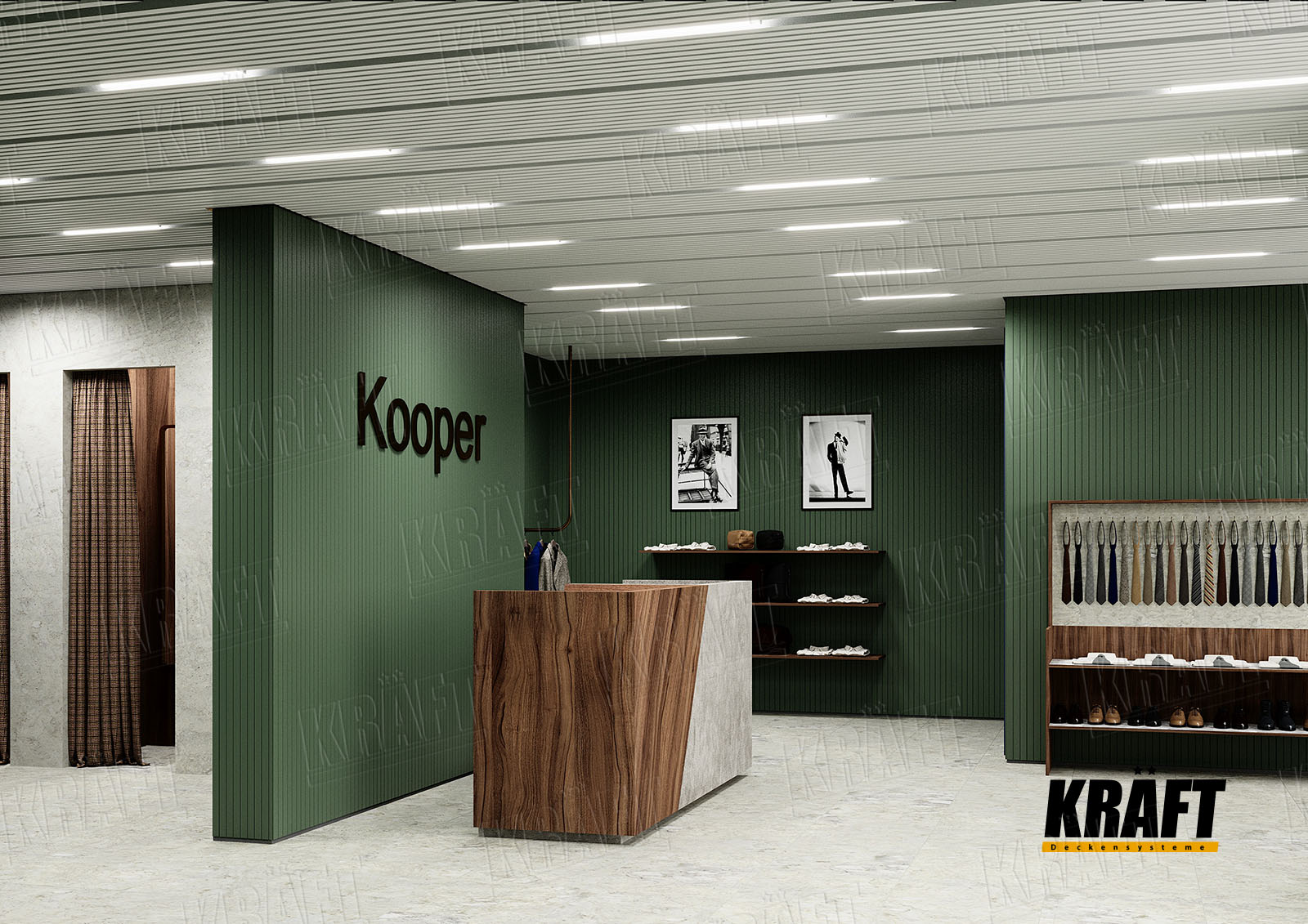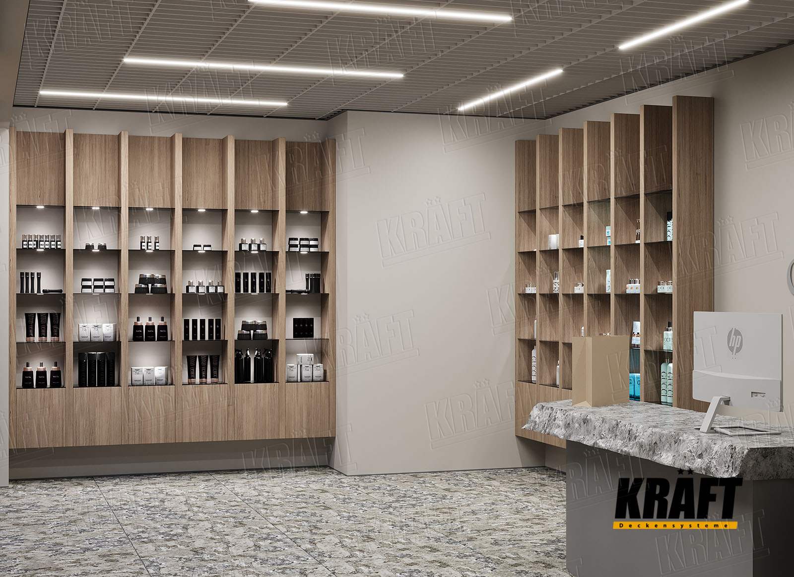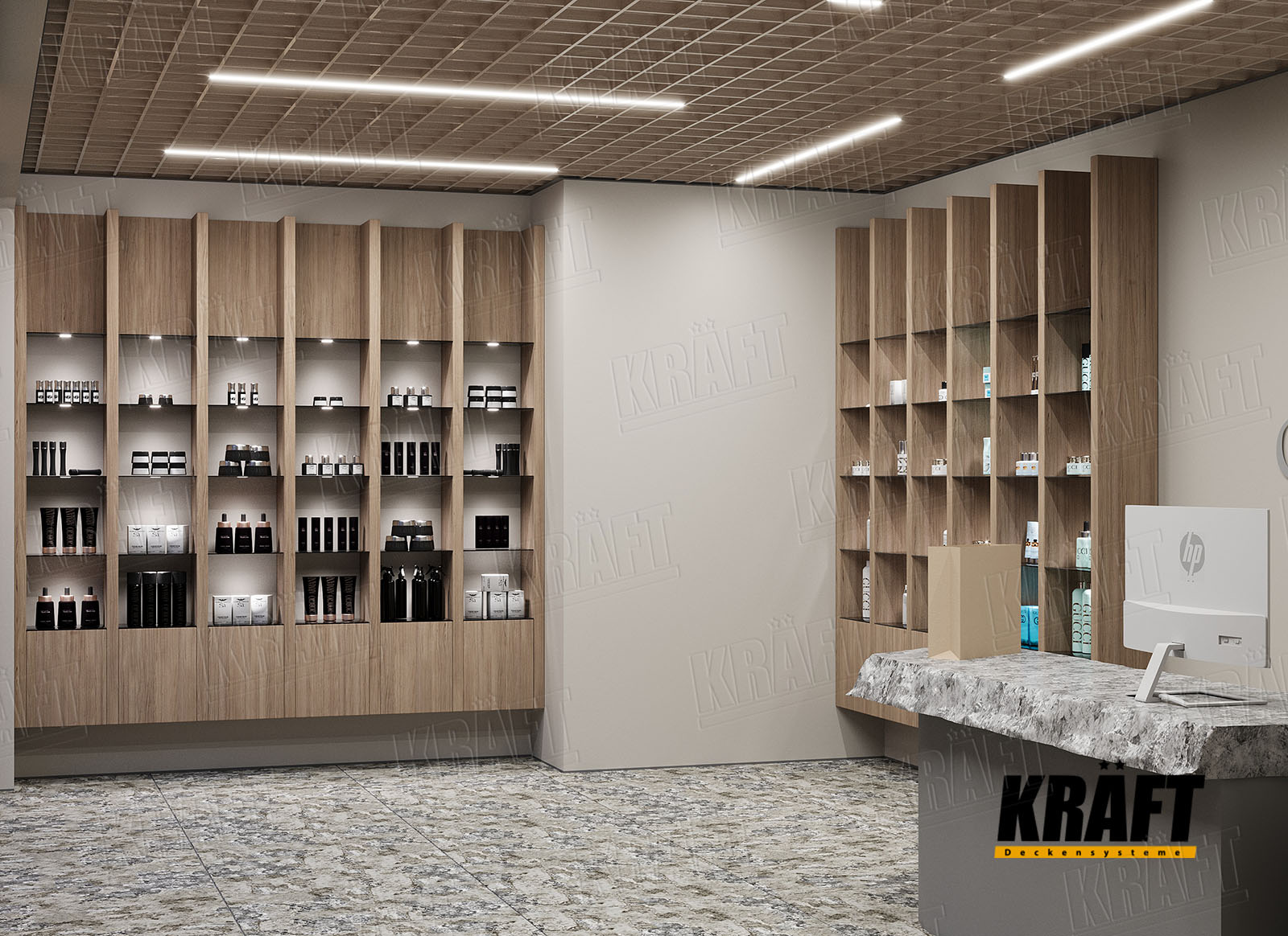 It is worth noting the possibility of combining different types of KRAFT suspended ceilings within a single interior. This approach not only helps to zone the space and highlight specific areas but also efficiently solves technical problems. For example, the main retail area can feature a transparent linear strip ceiling or open cell ceiling, ensuring proper ventilation and fire safety, while the cashier area or fitting rooms can have an acoustic ceiling to reduce noise. KRAFT Mesh expanded metal mesh panels are perfect for decorative inserts, creating suspended islands, or unique design accents. A well-thought-out combination of different systems allows the shop interior to be not only functional but also impressive, meeting modern requirements for safety and comfort.