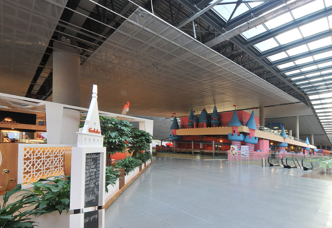 Acoustic ceilings are rarely used in retail spaces and shopping malls. The main reason is their zero transparency, which conflicts with fire safety regulations for public spaces. However, easy installation, low cost, and quick access to utilities make these ceilings a convenient solution for certain zones or when combined with other systems.