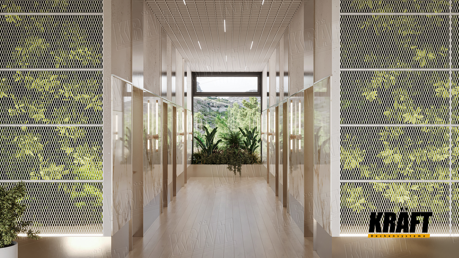 In addition to ceilings, KRAFT Mesh panels can be used on walls, facades, as enclosures, or as individual decorative elements. The panels can be equipped with special sound-absorbing materials, which improves acoustics but completely eliminates transparency.