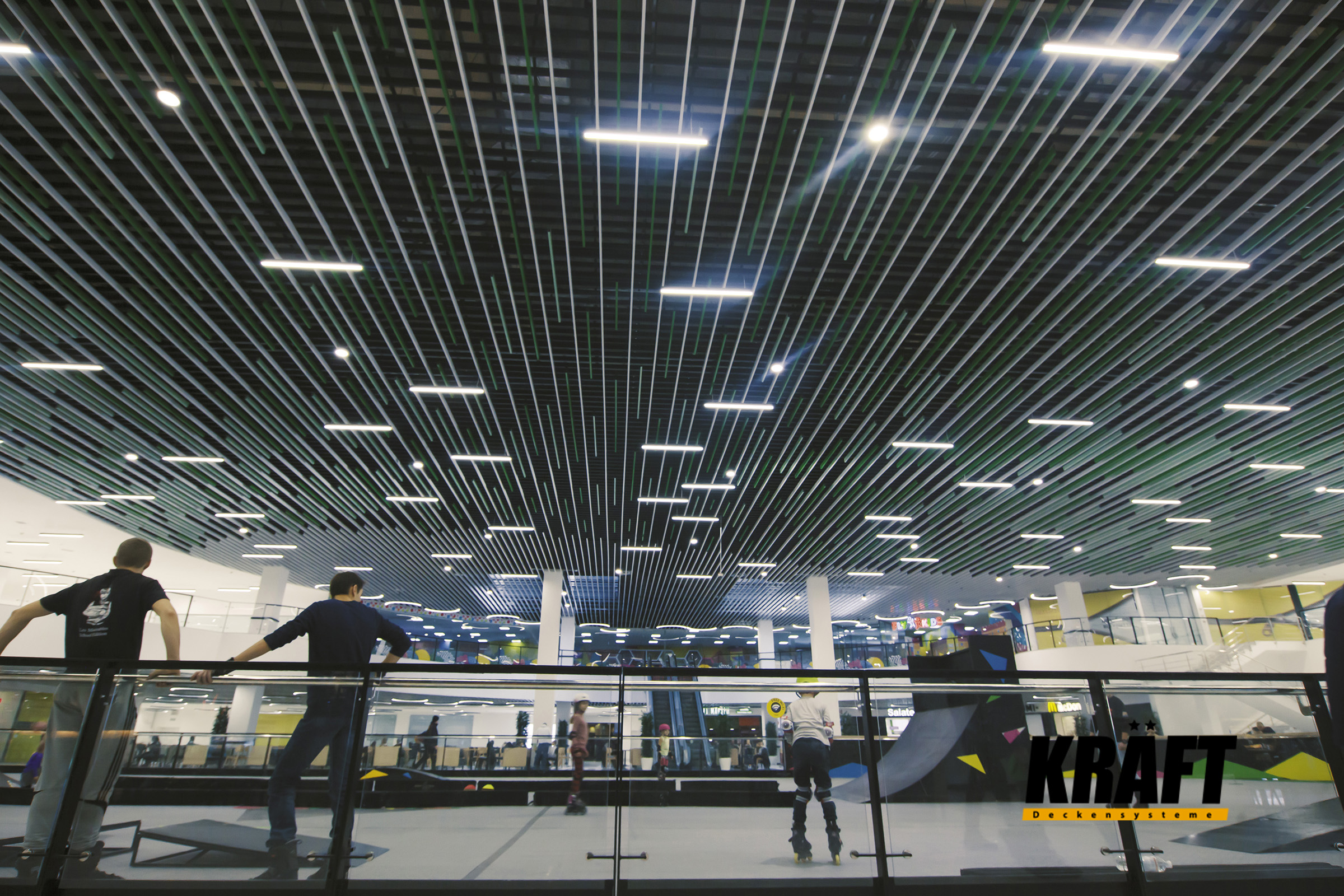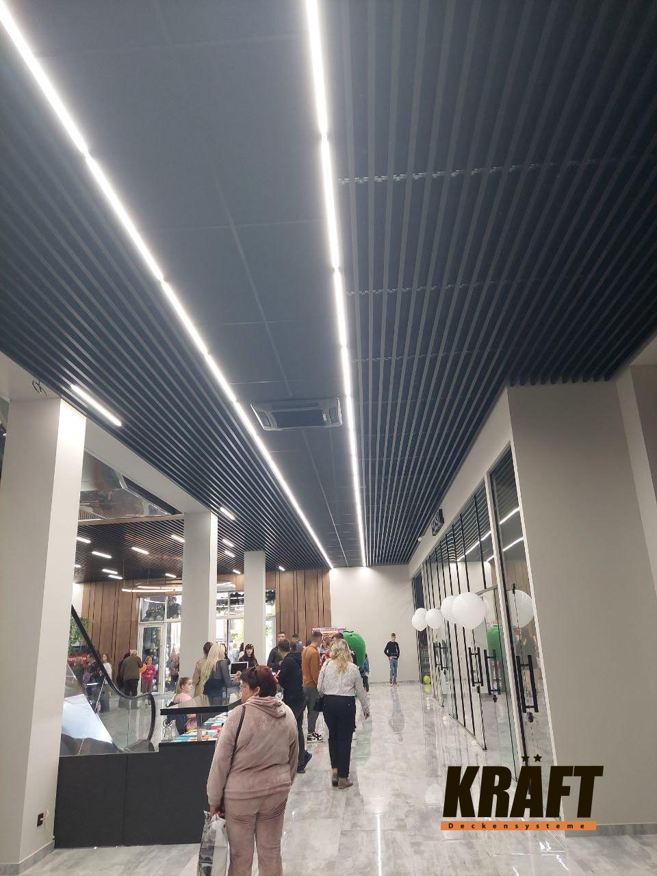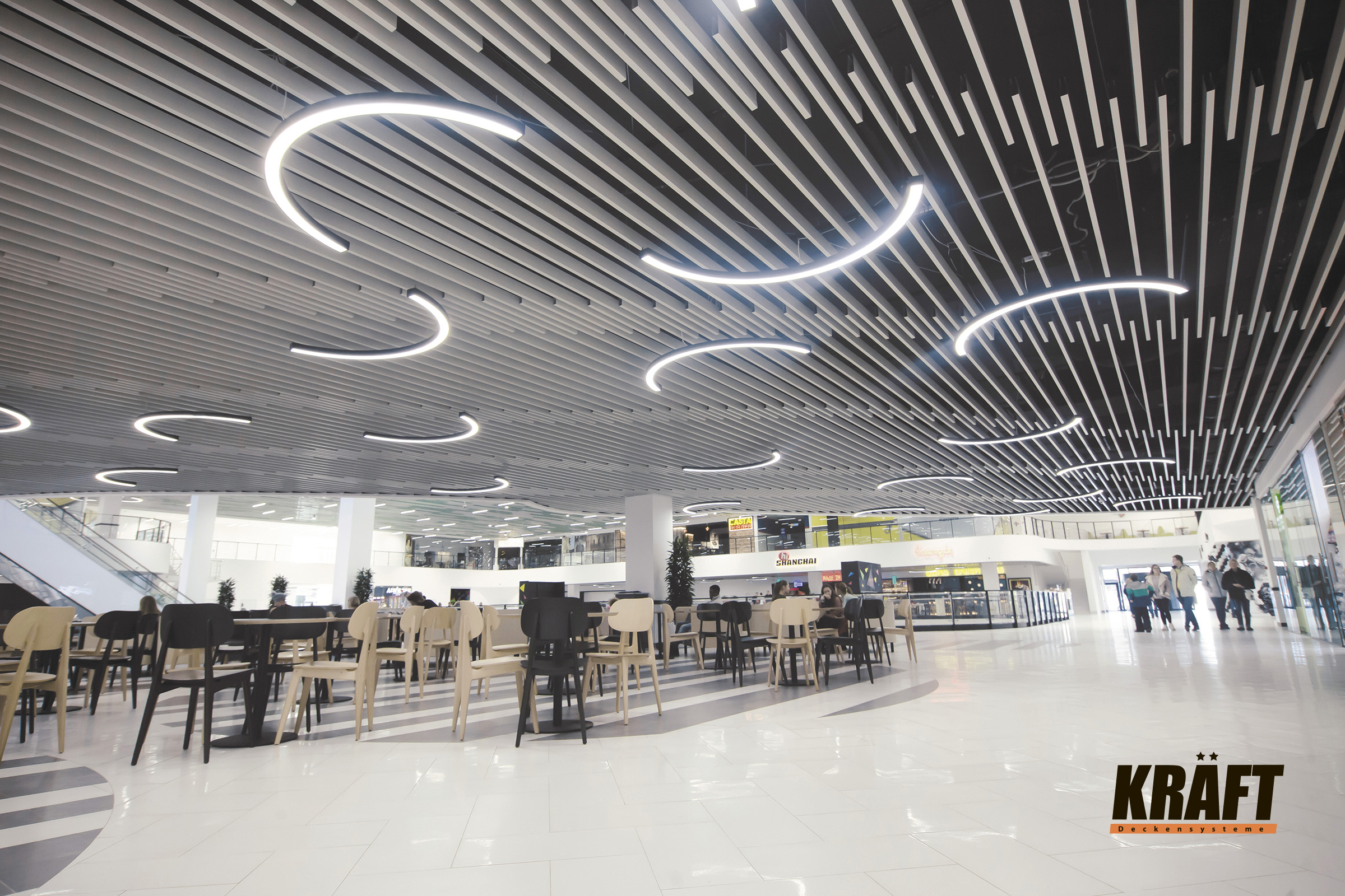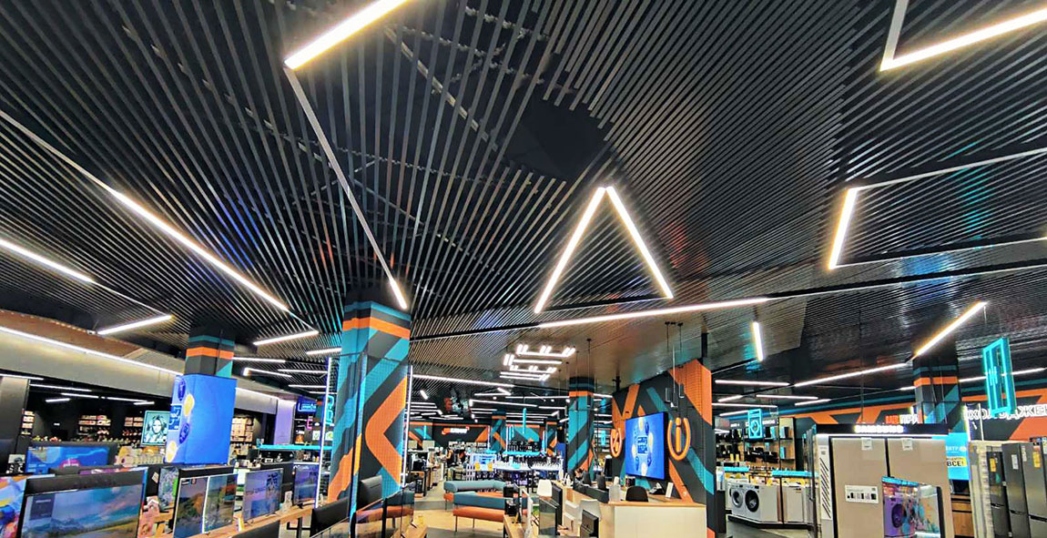 KRAFT linear strip ceilings are an excellent choice for shops and shopping malls where both functionality and impressive interiors are important.