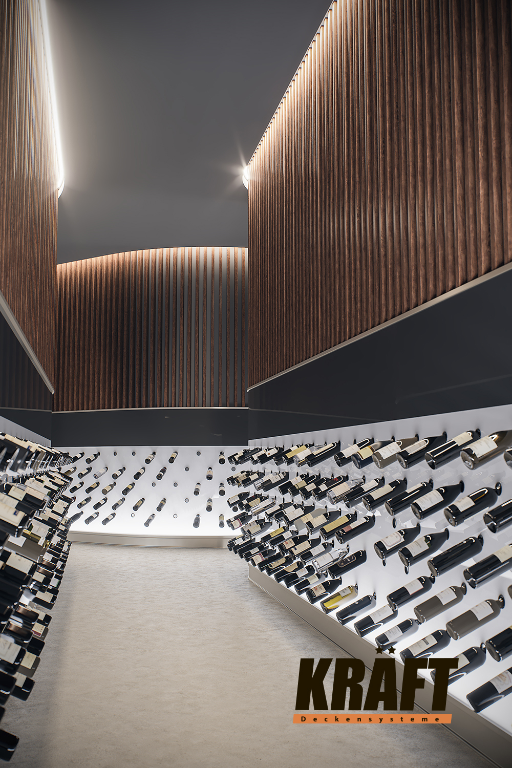 The design possibilities of KRAFT linear strip ceilings are practically unlimited. You can use rails of different widths and heights, change their direction, combine colors, and create unique constructions. Additional options are provided by flexible and single traverses, offering opportunities for implementing non-standard design solutions.