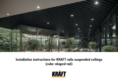 Certificates and specifications for suspended ceilings made of T-profiles, open cell ceiling grilyato, cube-shaped and plate-shaped rails, KRAFT Led lighting system.