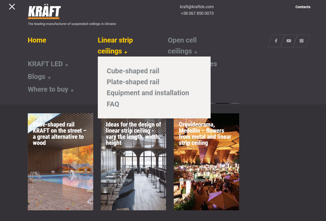 Ми винесли кожну групу підвісних стель у окремий пункт меню. В цих розділах можно знайти повну інформацію про кожний із продуктів KRAFT що виробляються: грильято, рейку, Т-профілі, металеві плити та освітлення KRAFT Led - загальна інформація, інформація стосовно монтажу та список поширених запитань стосовно конкретного типу підвісної стелі.