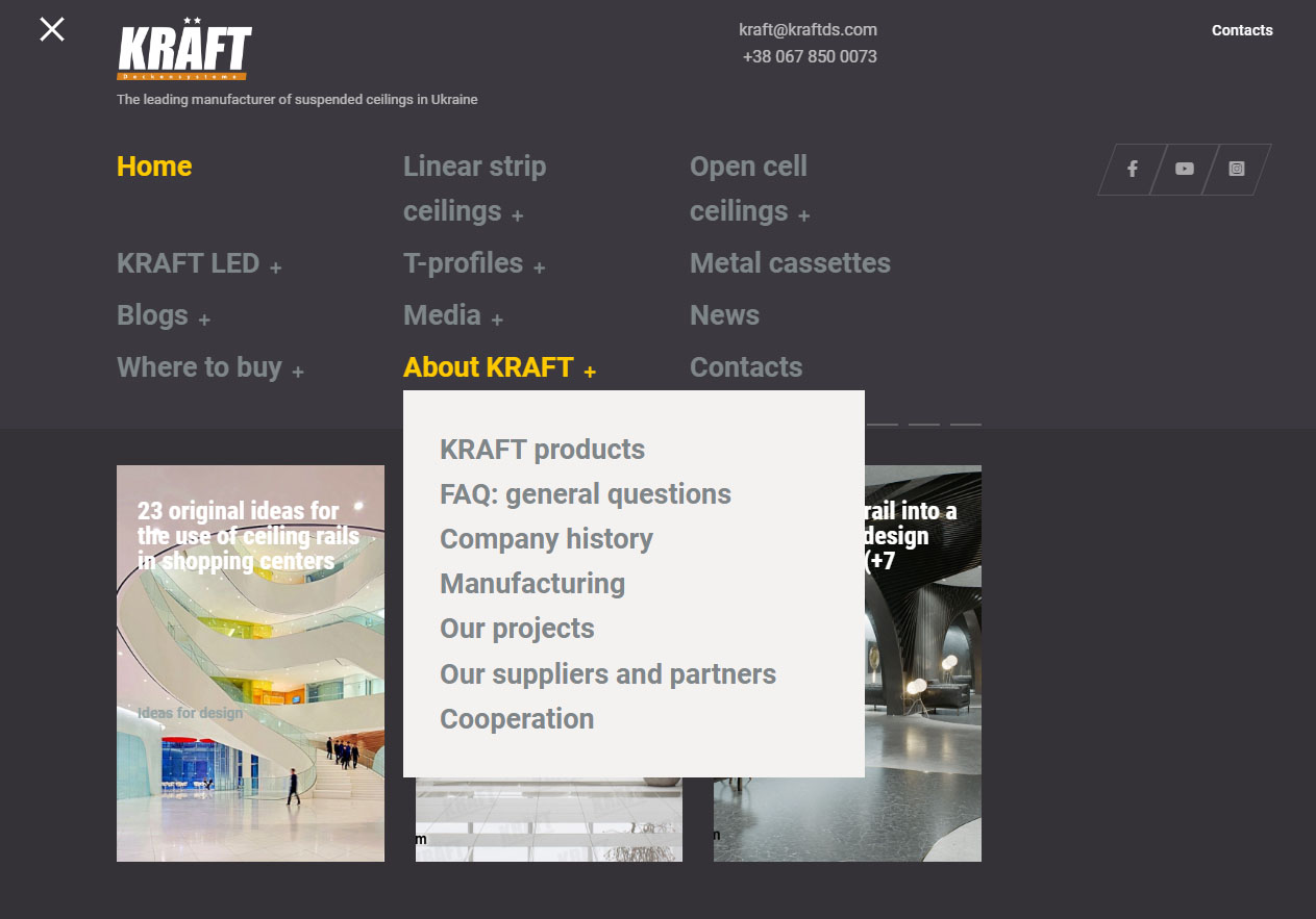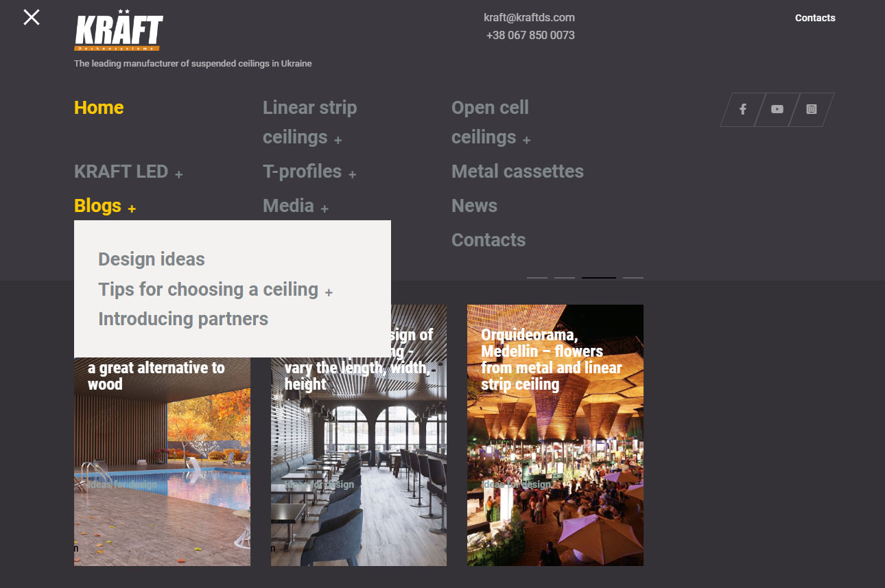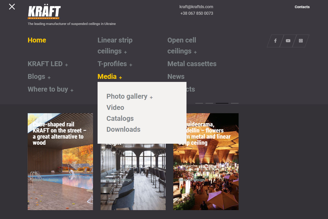 In the section "Ideas for design" you will find developments of designer suspended ceilings and photo reports of interesting objects using KRAFT products. It should be noted that the materials from the old site are still in the process of being transferred. As soon as these materials are placed, we will begin to place new objects, which have accumulated a lot.