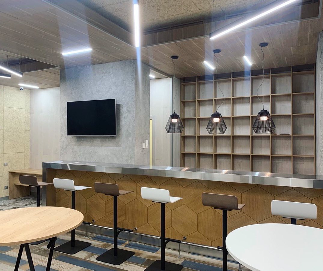 Burası basın toplantıları, sunumlar, eğitim ve seminerlere ev sahipliği yapan GDIP Medya Merkezi'nin kahvehanesidir. KRAFT Led armatürleri ideal bir seçenektir, çünkü odanın akustiğini bozmaz. İki tip armatür kullanıldı - T-Led (T-Profil iskeleti üzerinde kurulan tavan için) ve G-Led (Baffle Asma Tavan üzerinde kurulan armatürler).