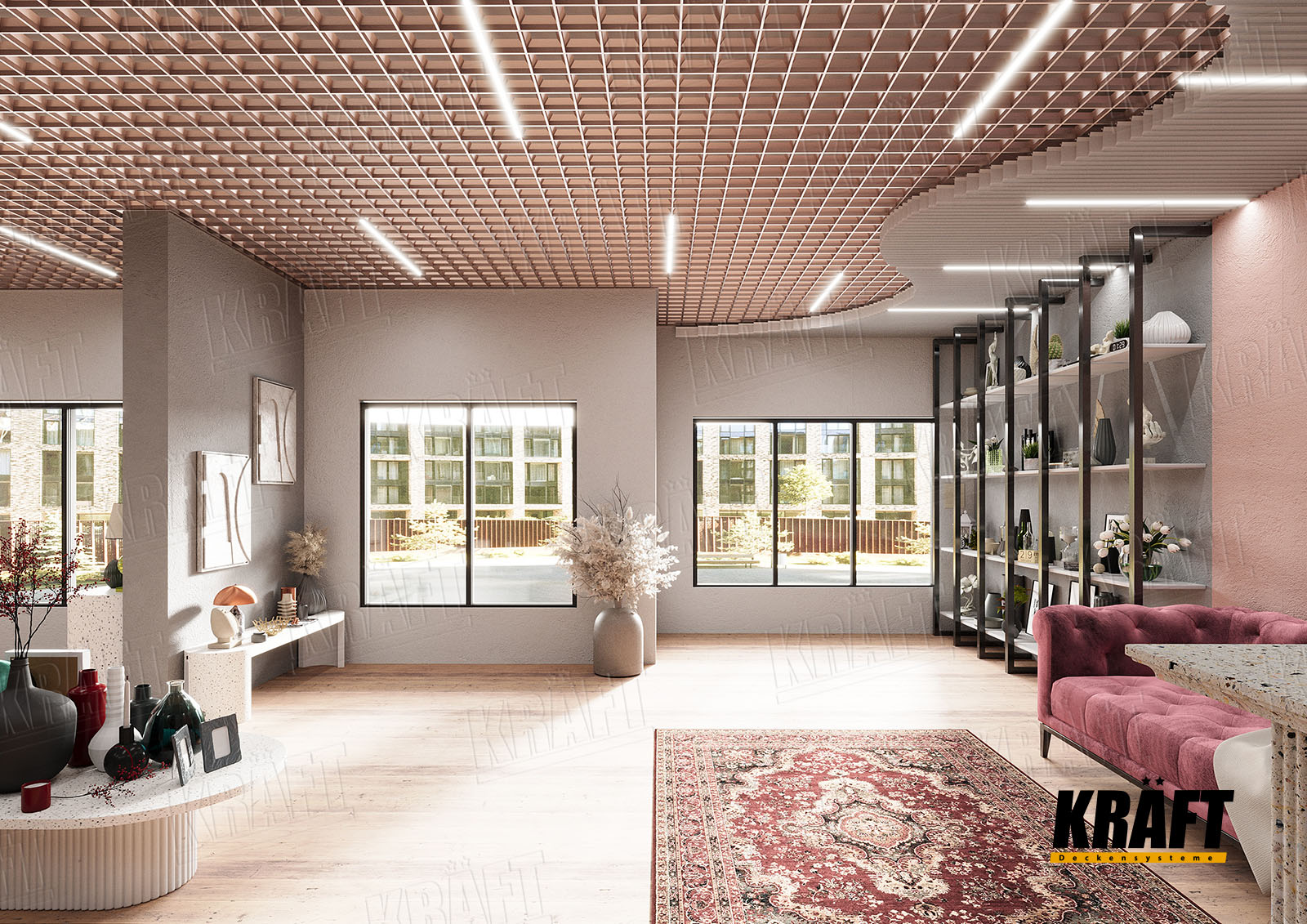 Asma tavanlar için zarif bir tasarım çözümü olarak, bu projede pratik deneyimler de gözlemlenebilir.