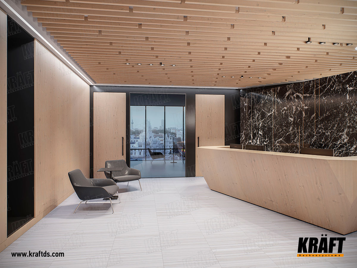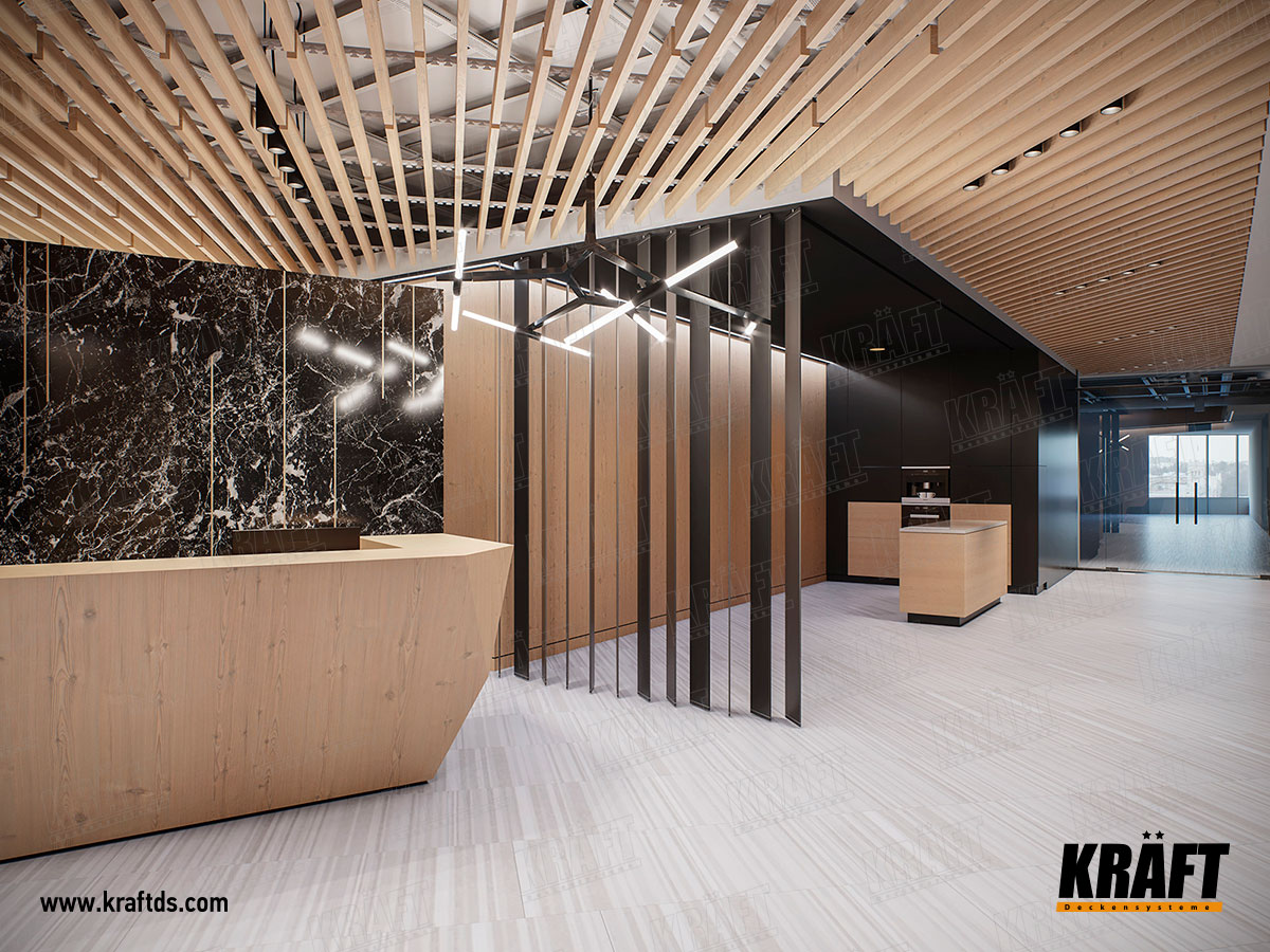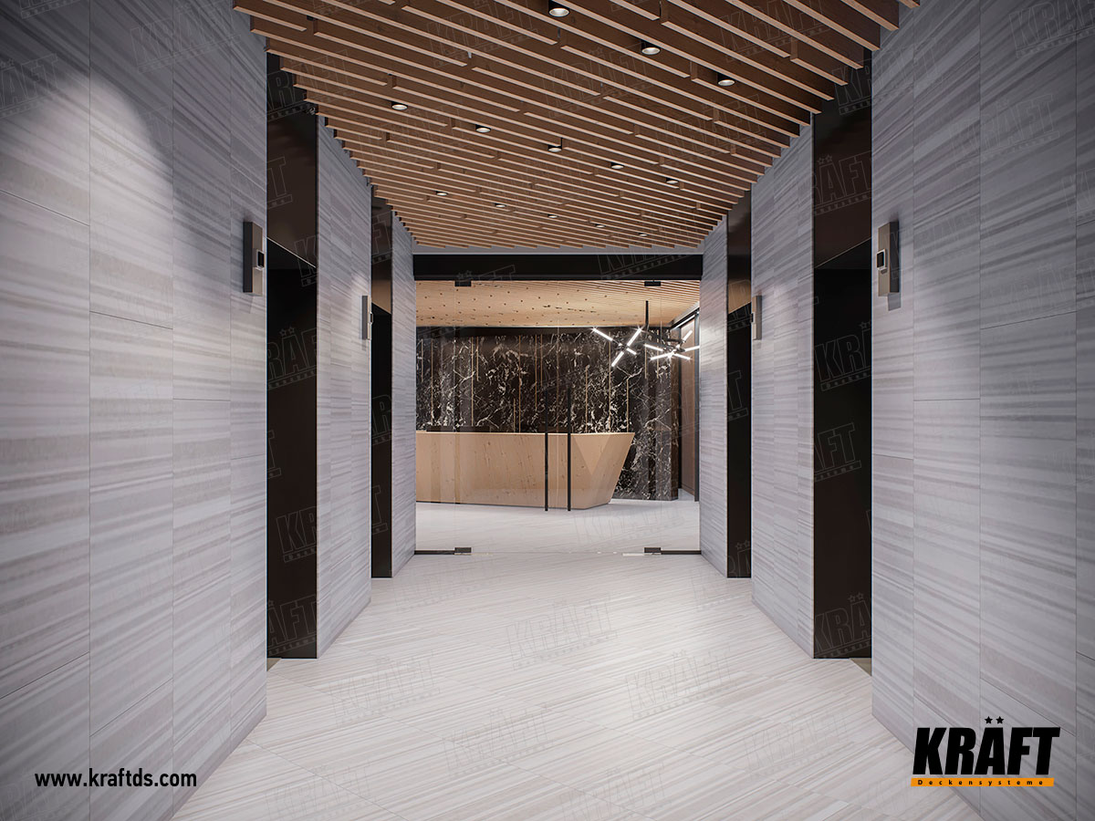 По-перше, вибір кольору. У проекті використовується кубоподібна рейка KRAFT з текстурою дерева. Така рейка практичніше при монтажі та експлуатації, ніж дерев'яна, а виглядає не гірше. Дерев'яна текстура пом'якшує холодні тони в інтер'єрі, надає приміщенню затишок і комфорт.