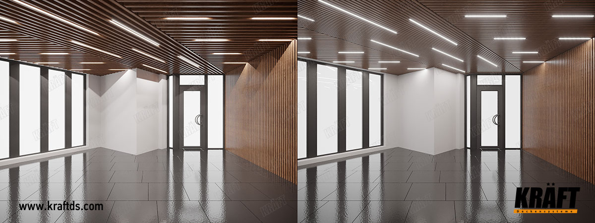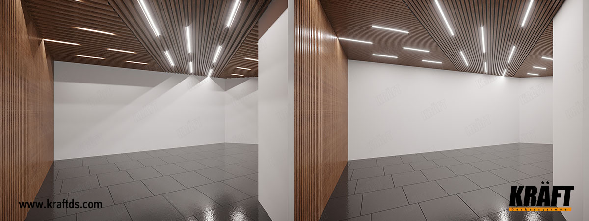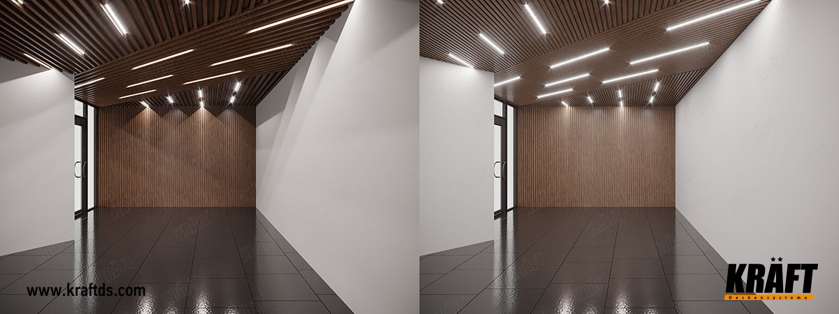 У приміщенні магазину на стелі та на однієї зі стін по дизайну була передбачена сталева кубоподібна рейка з текстурою дерева. Вибір саме металевої рейки, а не дерев'яної був обумовлений тим, що сталева рейка більш практична в експлуатації, а також відповідає вимогам пожежної безпеки. Тобто з вибором матеріалу і кольору підвісної стелі розбіжностей не виникло. Дизайнерське рішення про розташування окремих ділянок рейки під кутом 45 градусів до основного масиву також було прийнято на "ура" - інтер'єр відразу ж набував індивідуальність. А далі процес трохи загальмувався - адже стелі з рейки при всій простоті мають величезну варіативність. В даному випадку було запропоновано два варіанти дизайну стелі.