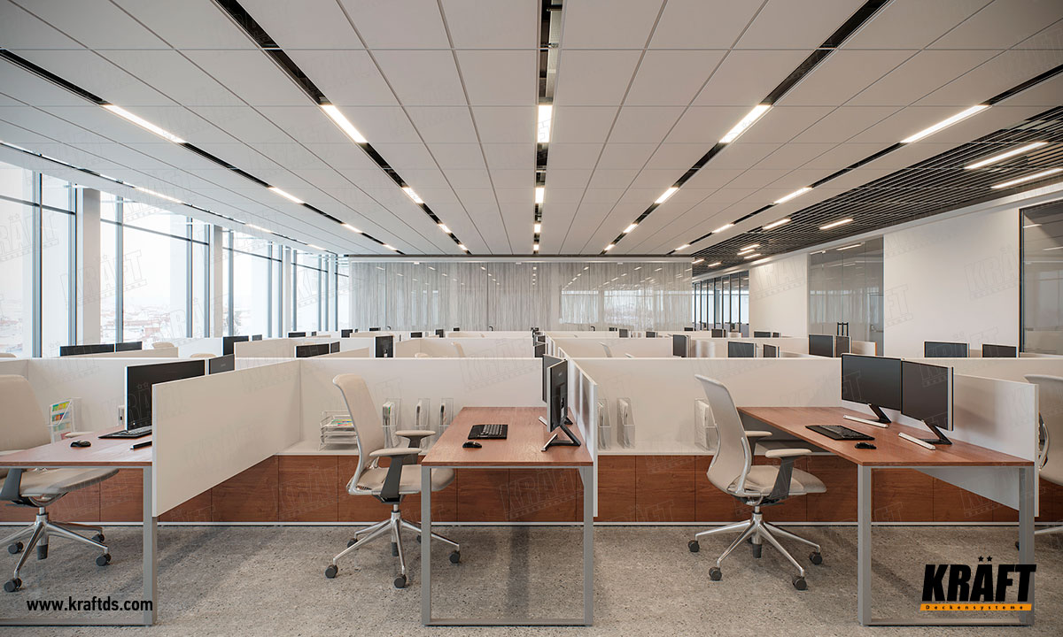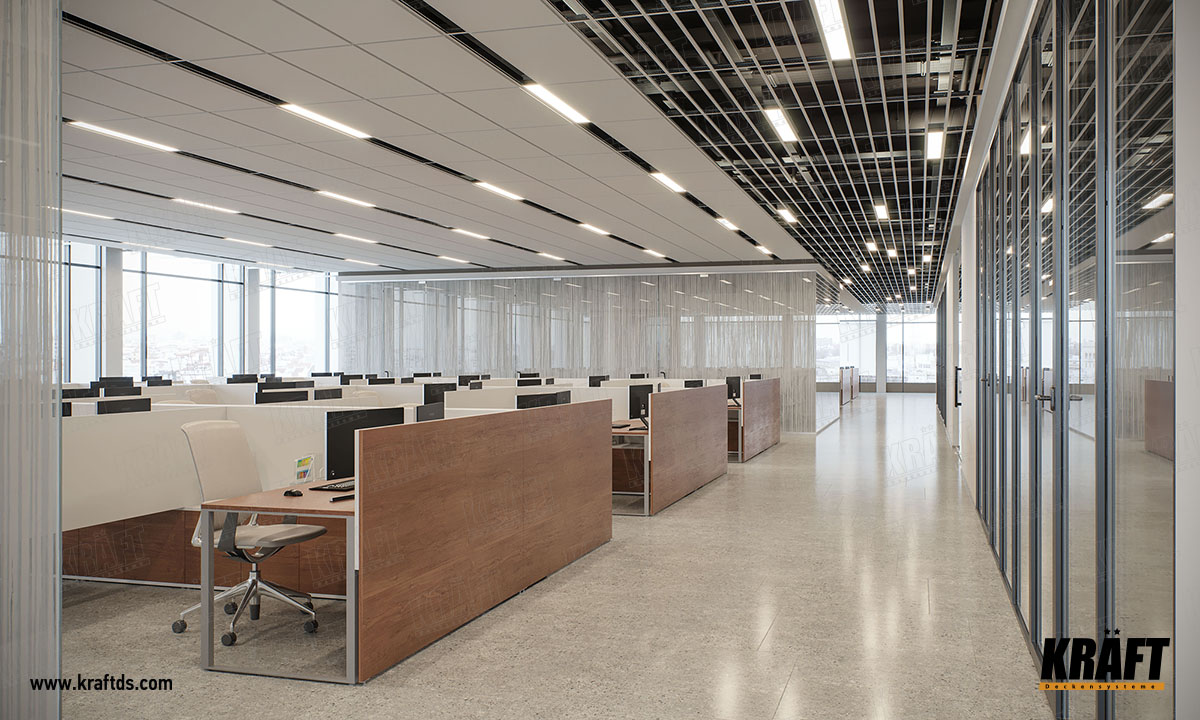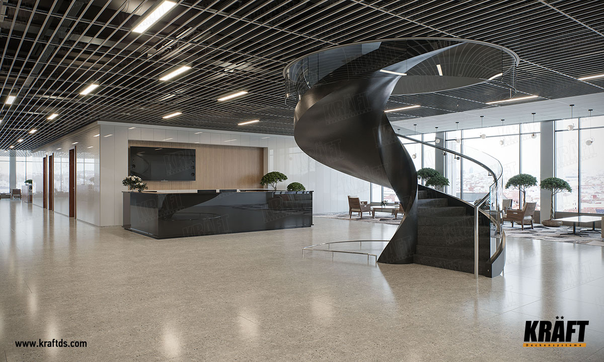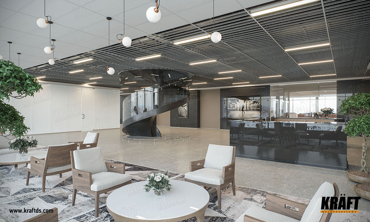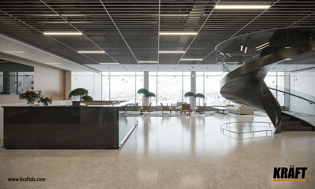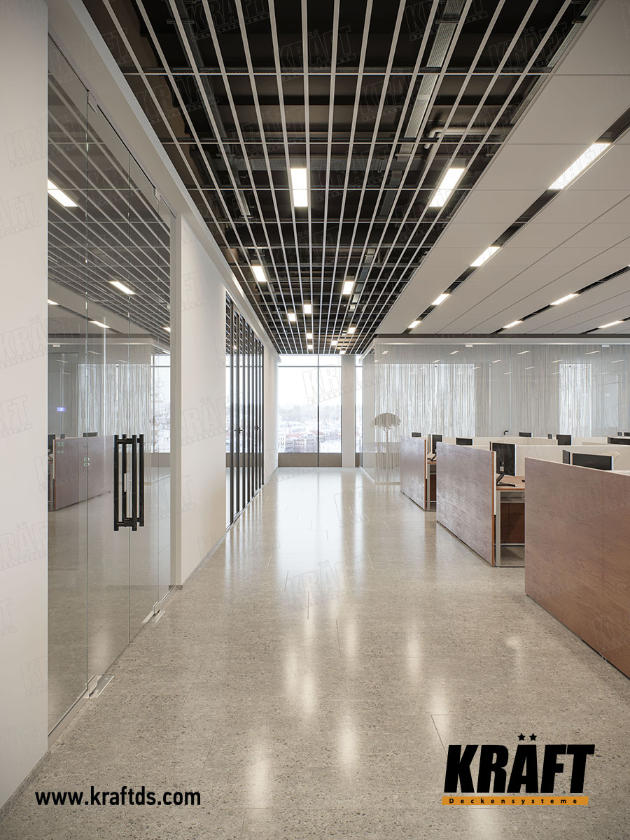 Але це тільки здається. При бажанні з Т-профілю можна зробити підвісну стелю, яка буде виглядати стильно і сучасно. На основних поздовжніх (3600 мм) Т-профілі KRAFT замки для поперечних напрямних розташовані через кожні 150 мм. Тому використовуючи напрямні 1200 мм або 600 мм, можна зробити стелю, яка виглядає чимось середнім між грильято жалюзі і рейковою стелею.