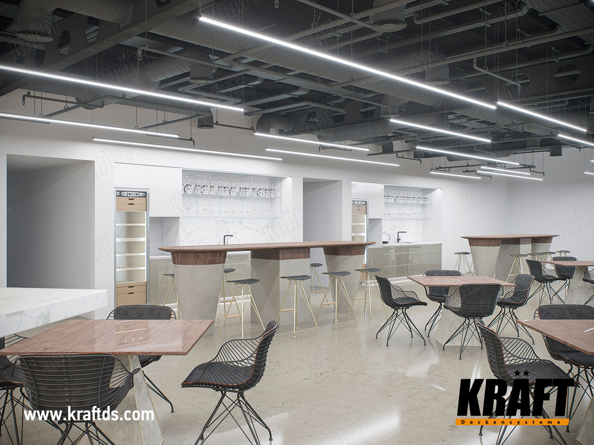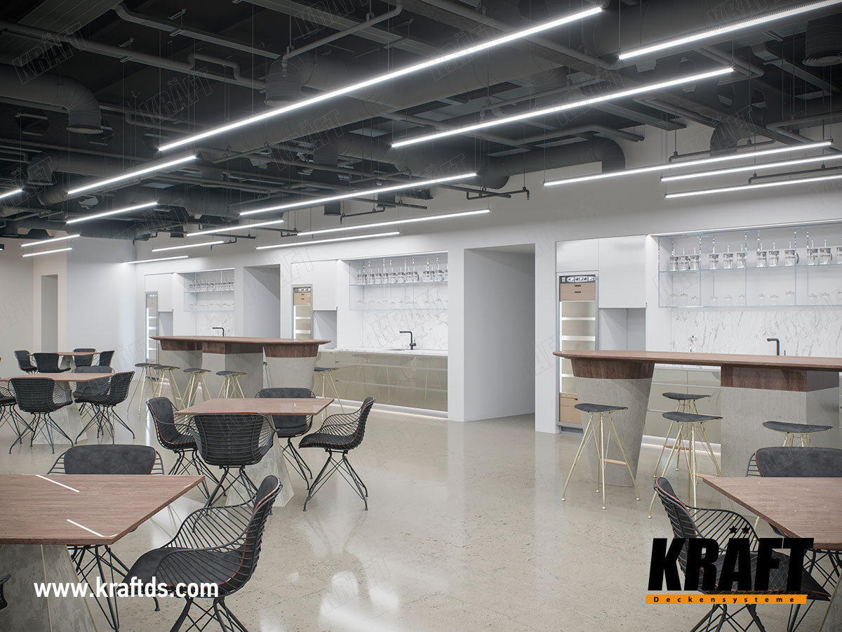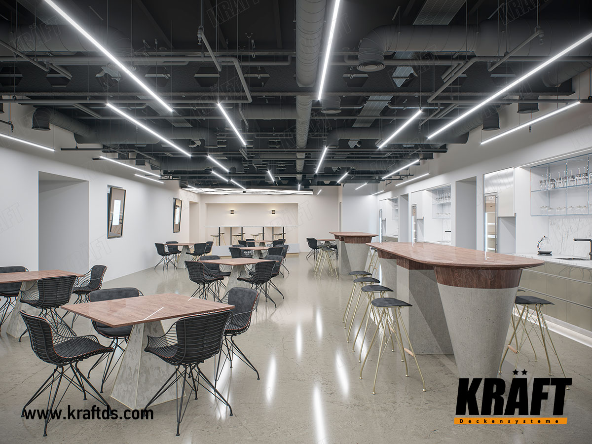 Переплетення комунікацій на стелі як найкраще підходило до загального стилю інтер'єру, тому було вирішено не використовувати підвісні стелі, а обмежитися тільки освітленням. Компанією KRAFT розроблена серія світильників K-Led, придатних для будь-яких типів стель. Завдяки невеликій масі їх можна кріпити навіть на власних проводах. В інтер'єрі цього приміщення використовувалися світильники довжиною 2,4 і 3,6 м. Рівень освітленості був розрахований в програмі Dialux, а з міркувань дизайну світильники розташували асиметрично, таким чином створюючи ілюзію руху. В результаті вийшов стильний інтер'єр з економічною системою освітлення KRAFT Led.