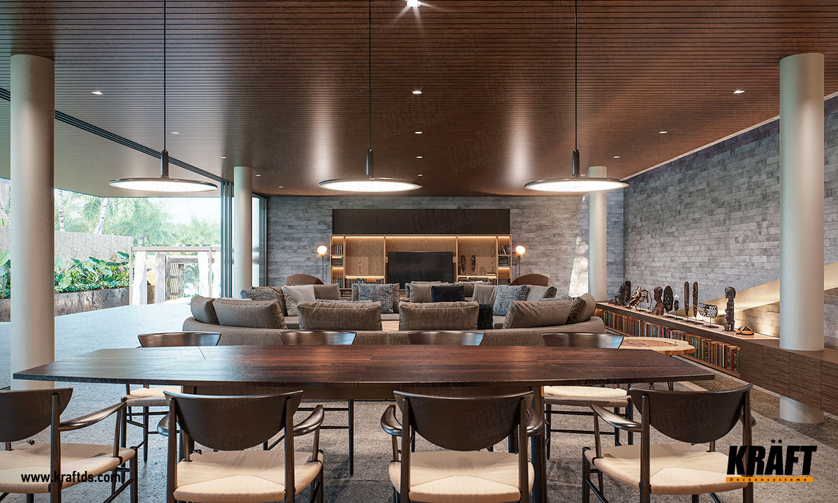 Ми не будемо говорити, що на фото нижче реалізовані якісь круті дизайнерські рішення для підвісних стель. Більшою мірою ці фото дають уявлення про те, наскільки органічно рейка KRAFT з текстурою дерева буде виглядати в такому інтер'єрі.