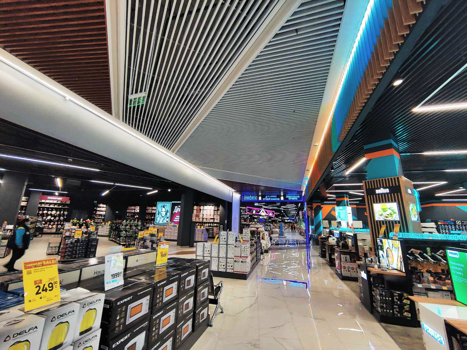Які ж дизайнерські прийоми використовувалися під час оформлення підвісної стелі? Насамперед можна помітити, що вся стеля розбита на окремі сегменти. В цьому випадку погляду людини є за що "зачепитися", сфокусувати свою увагу. По-друге, це колір. Ми можемо побачити кубоподібну рейку KRAFT у трьох кольорах – білому, чорному та з текстурою дерева. По-третє – у кожному із сегментів рейка змонтована під своїм кутом. І по-четверте, окремі острівці кубоподібної рейки з дрібнішим кроком помітно виділяються із загального масиву. Окремі сегменти на стелі прив'язані до певних зон внизу - таким чином, наприклад, позначений ресепшн та проходи в торговому залі.