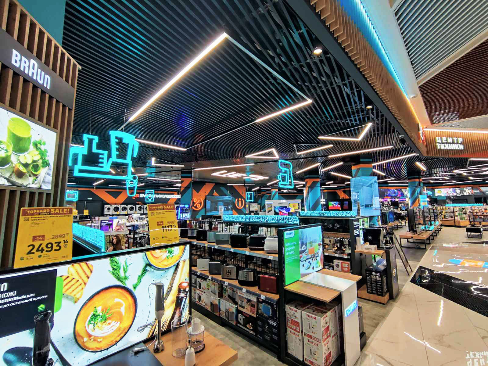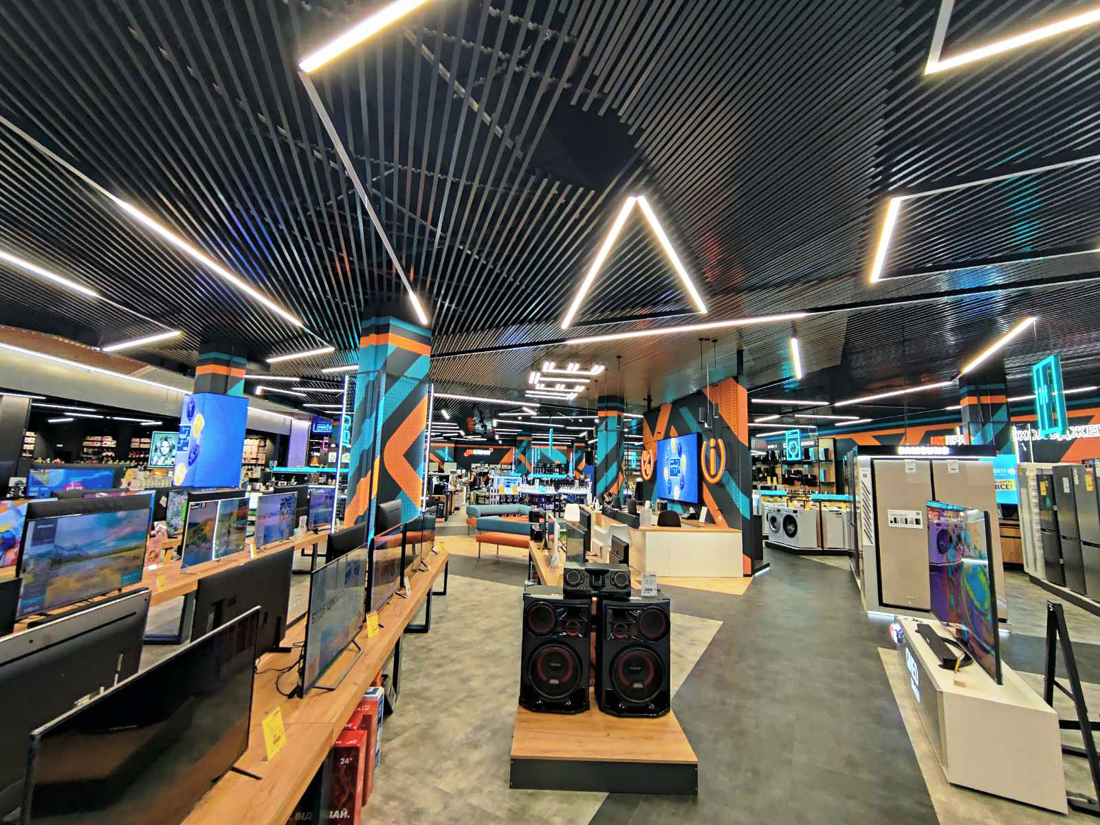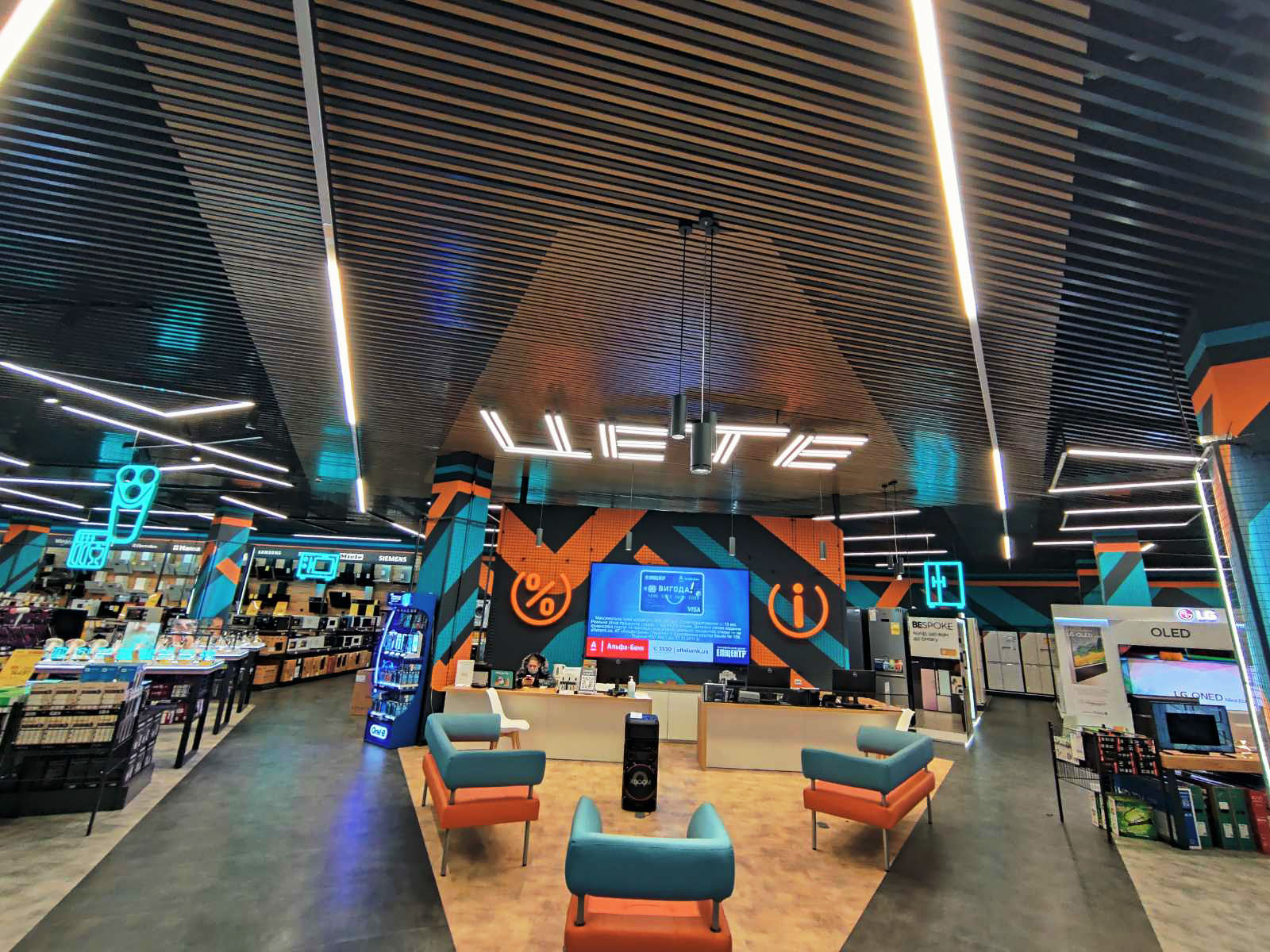 У торговому залі магазину техніки "ЦеТе" з приводу дизайну особливо і не розгорнешся - більшу частину приміщення займає безпосередньо техніка. І практично єдиним елементом, з яким можна попрацювати дизайнеру, залишаються колони і стеля. Незважаючи на обмежений набір інструментів для творчості, дизайнери змогли придумати та витримати єдиний стиль приміщення. І в основному це стало можливим завдяки рейковій підвісній стелі KRAFT - інші елементи інтер'єру підтримують цілісність загального вигляду.