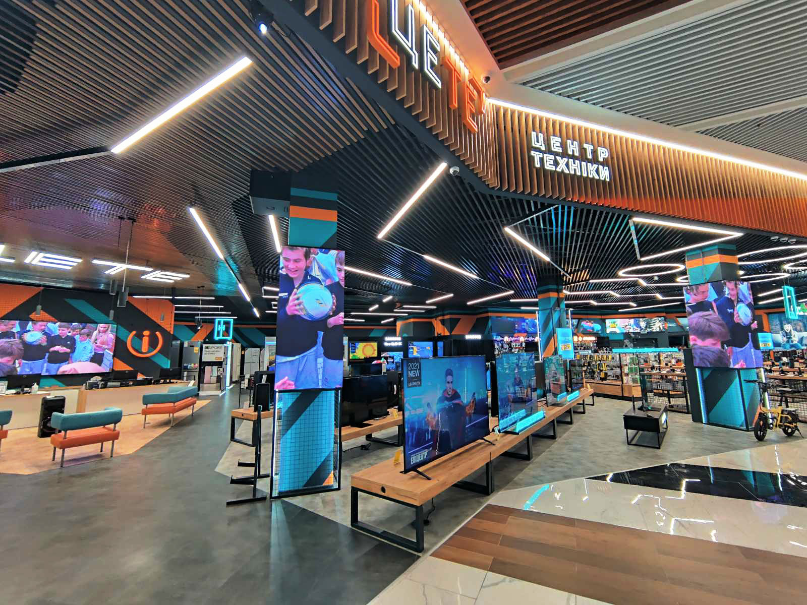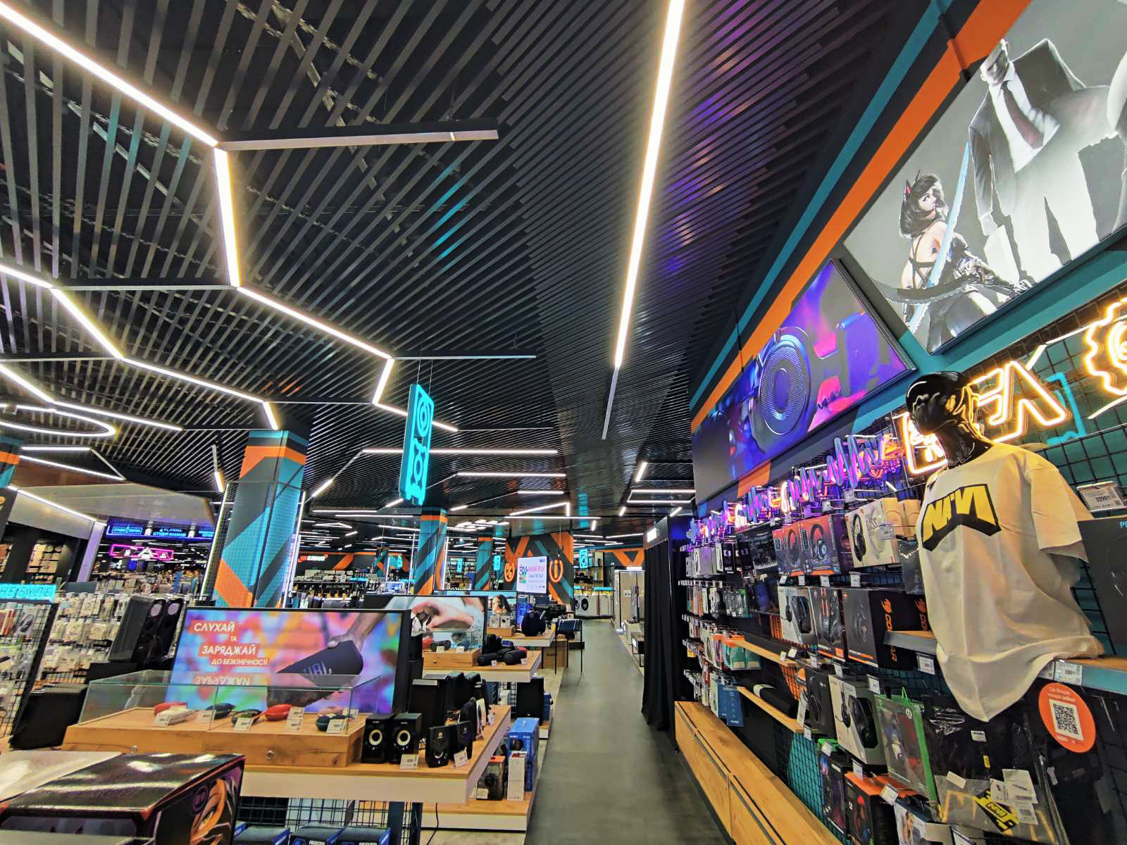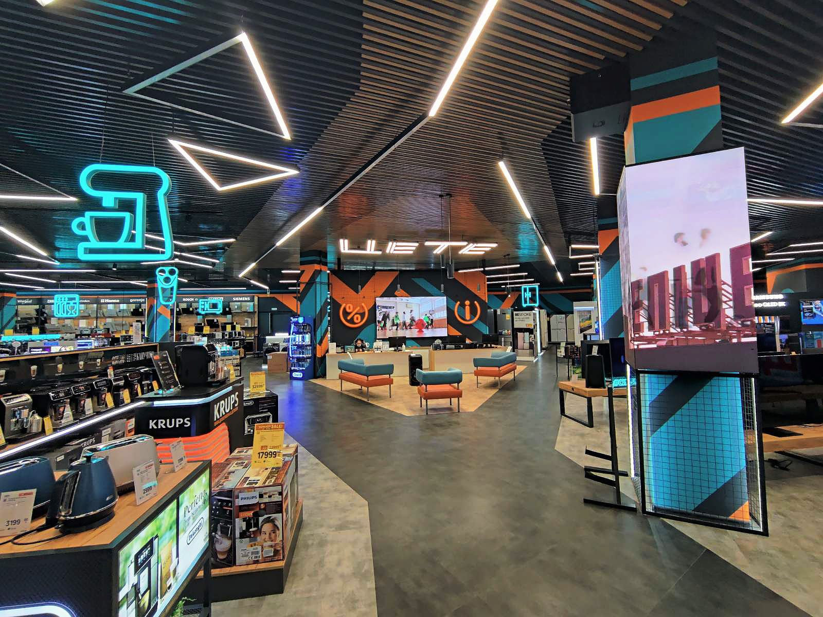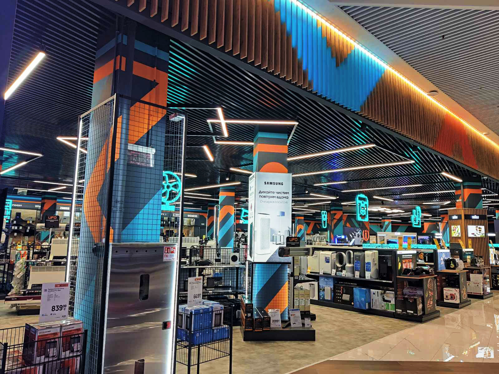 У торговому залі магазину техніки "ЦеТе" з приводу дизайну особливо і не розгорнешся - більшу частину приміщення займає безпосередньо техніка. І практично єдиним елементом, з яким можна попрацювати дизайнеру, залишаються колони і стеля. Незважаючи на обмежений набір інструментів для творчості, дизайнери змогли придумати та витримати єдиний стиль приміщення. І в основному це стало можливим завдяки рейковій підвісній стелі KRAFT - інші елементи інтер'єру підтримують цілісність загального вигляду.