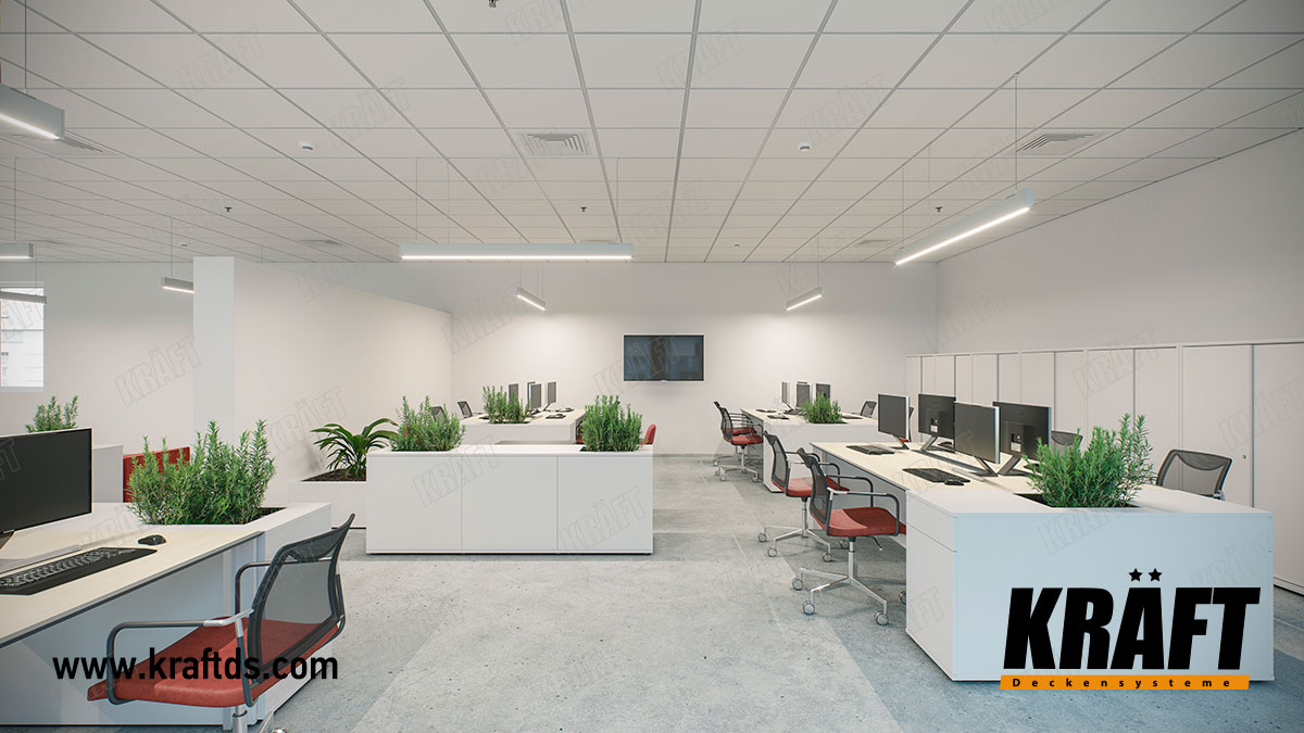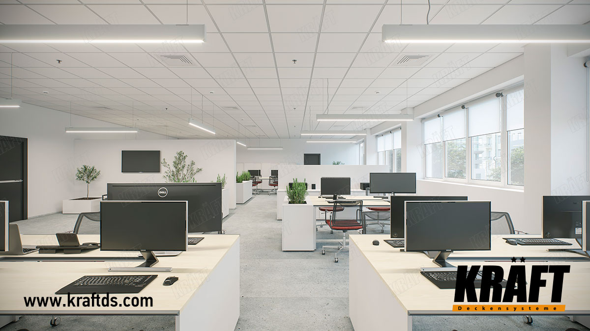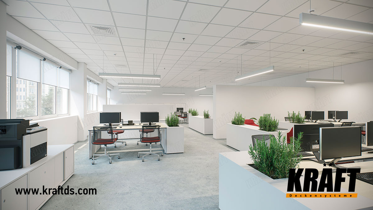 Для забезпечення потрібного рівня освітленості растрові світильники або LED-панелі доводиться рівномірно розташовувати по всій площі приміщення. А світильники KRAFT K-Led можна встановлювати безпосередньо над робочими поверхнями. При такій точкової розстановці, світильників потрібно менше, ніж в першому прикладі.