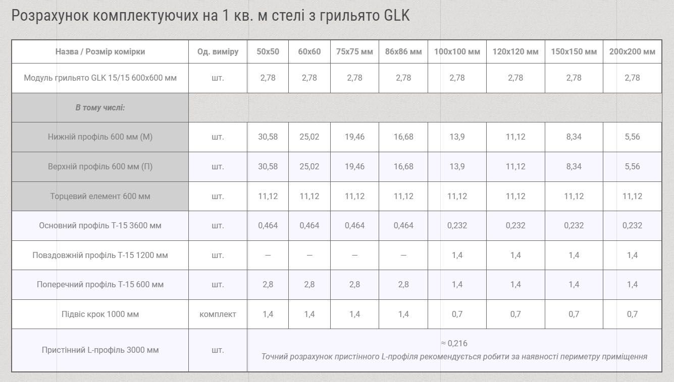 Розрахунок комплектуючих на 1 кв. м стелі з грильято GLK