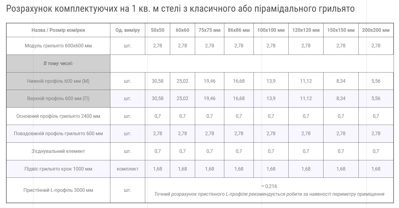 Розрахунок комплектуючих на 1 кв. м стелі з класичного або пірамідального грильято