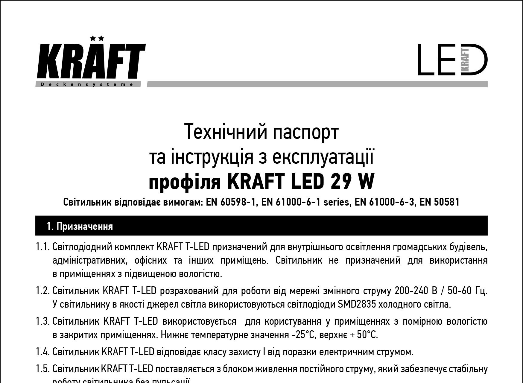 Технічний паспорт світильника KRAFT T-LED 29W (UA)