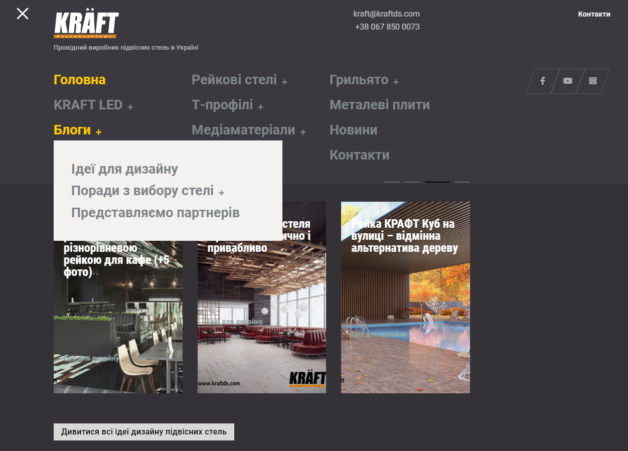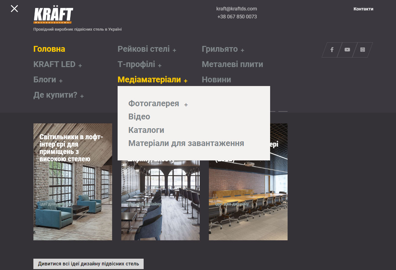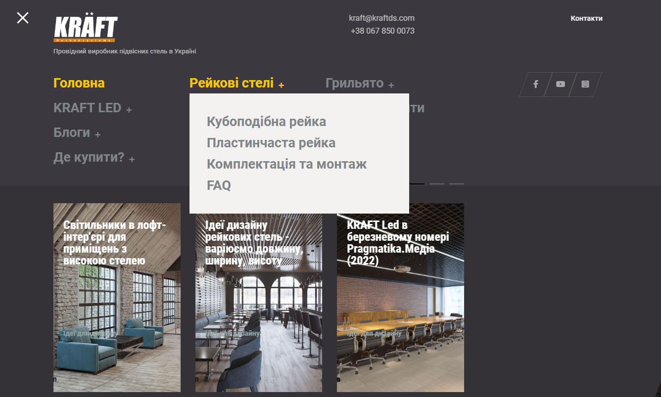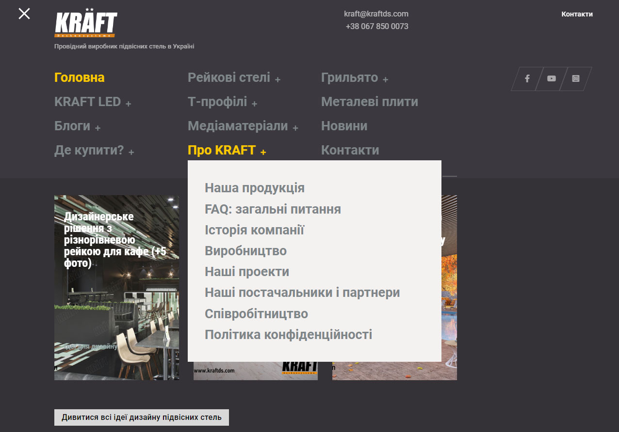 Ми винесли кожну групу підвісних стель у окремий пункт меню. В цих розділах можно знайти повну інформацію про кожний із продуктів KRAFT що виробляються: грильято, рейку, Т-профілі, металеві плити та освітлення KRAFT Led - загальна інформація, інформація стосовно монтажу та список поширених запитань стосовно конкретного типу підвісної стелі.