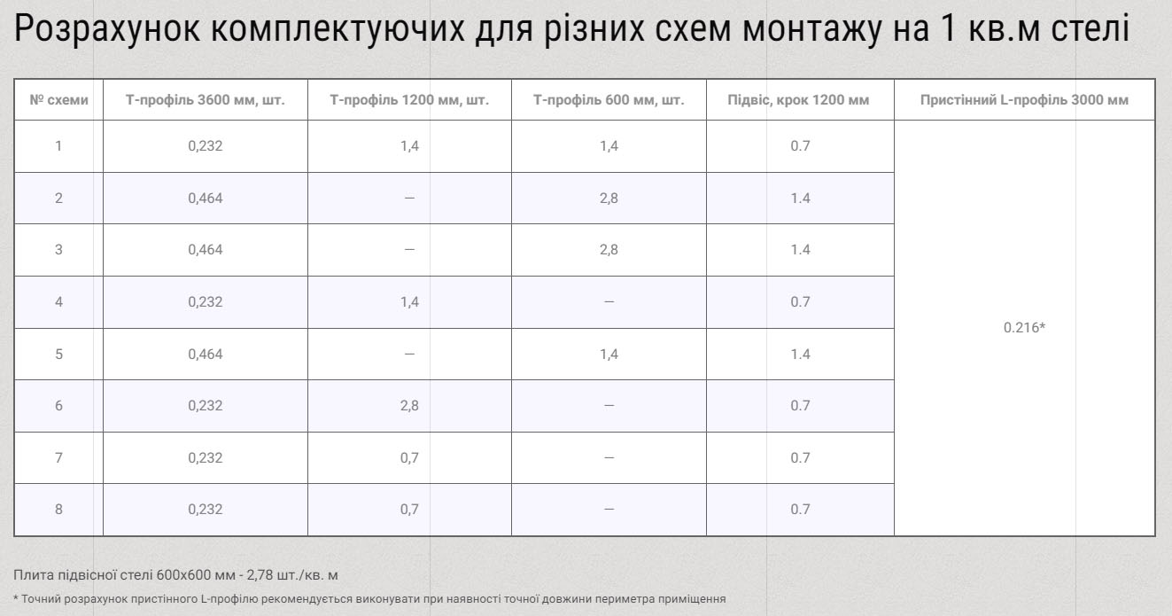 Розрахунок комплектуючих для різних схем монтажу на 1 кв.м стелі