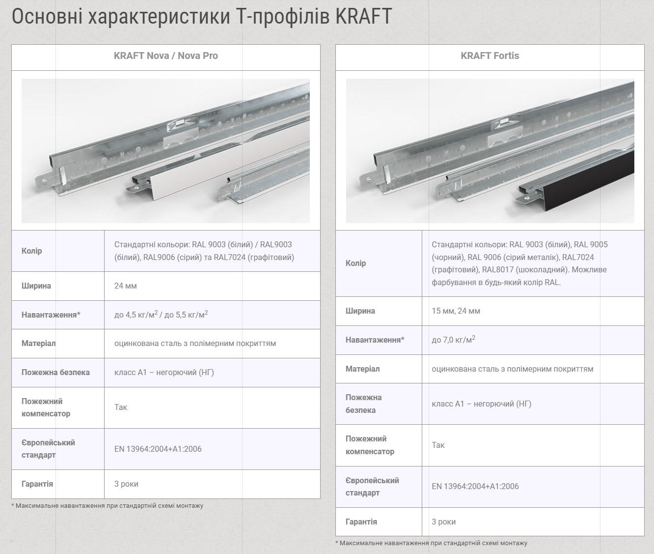 «КРАФТ Декенсістем» випускає дві основні моделі профілів: NOVA (Nova Pro) та FORTIS. Також під замовлення виробляємо Т-профілі спеціального призначення KRAFT HD (підвищеної міцности) та KRAFT RH100 (підвищеної вологостійкості).
