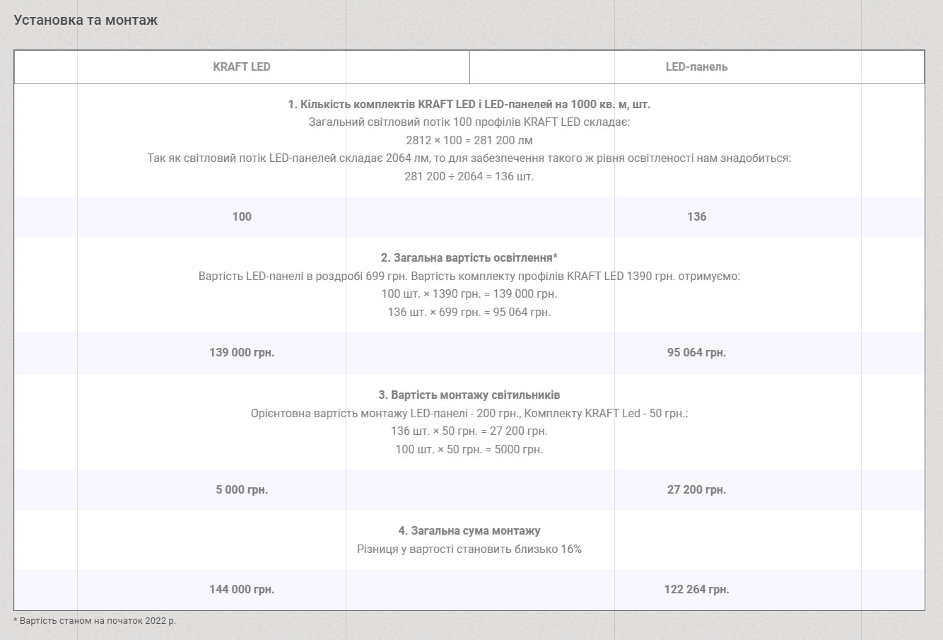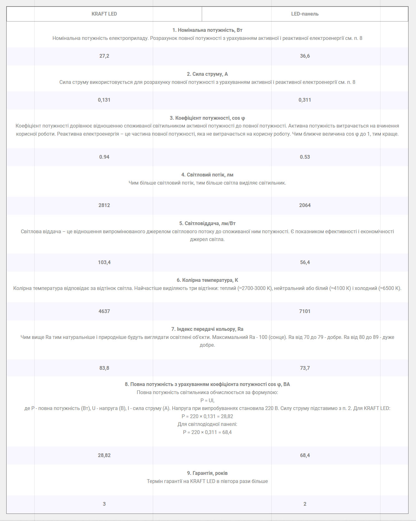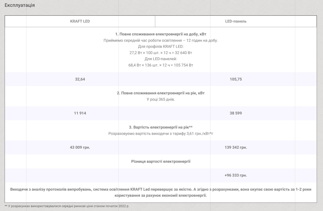 Виходячи з аналізу протоколів випробувань, система освітлення KRAFT Led перевершує панелі за якістю. А згідно з розрахунками, вона окупає свою вартість за 1-2 роки користування за рахунок економії електроенергії.